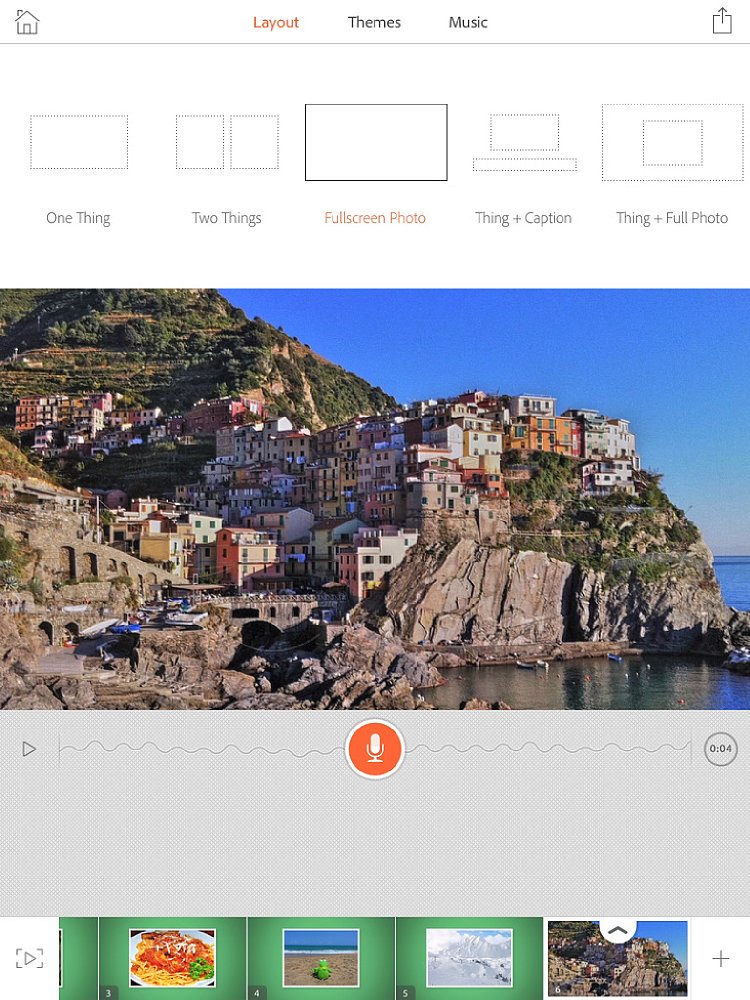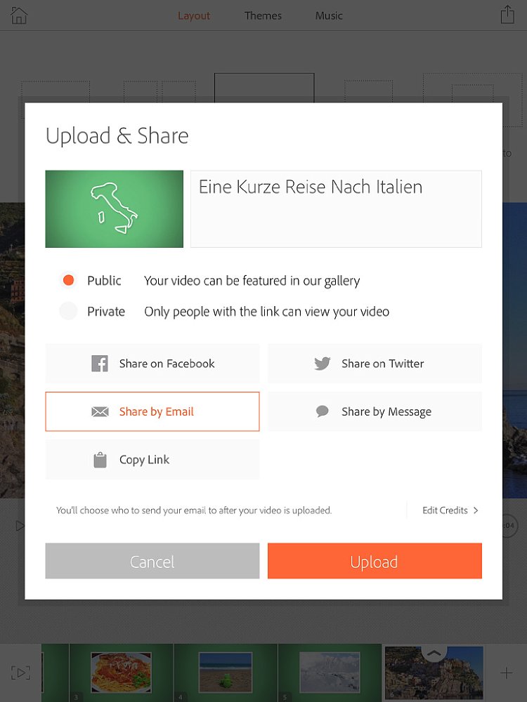 Nachdem du dein Werk fertig gestellt hast, kannst du das Layout anpassen, ein anderes Thema verwenden oder eine neue Musik auswählen. Denn auch was den musikalischen Hintergrund anbelangt, hat die Adobe-App was zu bieten. Unter Music findest du alle nach Stil und Rhythmus sortierten Klänge, die anwendbar sind. Gefällt dir dein fertiges Werk gut, kannst du die Upload-&-Share Funktion aufrufen und in wenigen Klicks deine Videoanimation per E-Mail beziehungsweise auf Facebook, Twitter oder der eigenen Webseite veröffentlichen. Um fertige Videos teilen und exportieren zu können, wird allerdings eine Adobe-ID oder ein Facebook-Login benötigt, denn alle fertigen Projekte werden auf den Server von Adobe hochgeladen. Was du verteilst, ist lediglich ein Link zu deinem Video. Doch kannst du festlegen, ob die Geschichte öffentlich sein kann oder nur für Personen abrufbar, die den Link besitzen. Schade, dass keine lokale Kopie des Videos gespeichert werden kann.