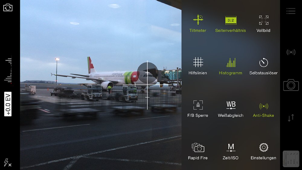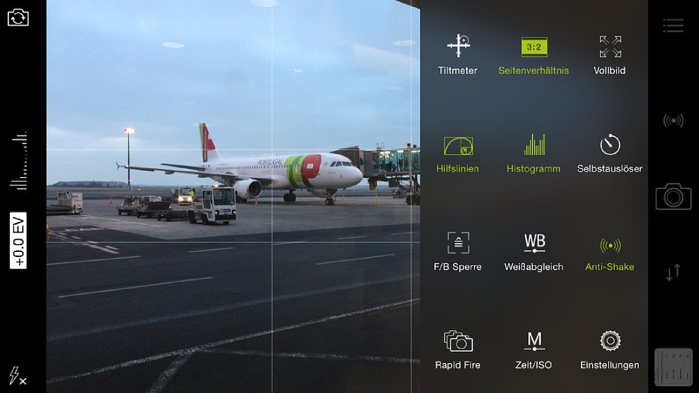 Seit iOS 8 dürfen mobile Anwendungen auf sämtliche Kamerafunktionen des iPhone zugreifen – der Produktname "ProCamera 8" ist also nicht zufällig gewählt, denn diese (übrigens in Deutschland entwickelte) App tut genau dies. Wenn du die ProCamera-App aufrufst, findest du zunächst einen aufgeräumt wirkenden Sucher vor, der sich den Bildschirmmaßen deines iPhones anpasst, um das gesamte Blickfeld zu nutzen und abzulichten. Alternativ kannst du natürlich auch ein Standard-Seitenverhältnis (4:3, 3:2, 16:9, 1:1 oder 3:1) auswählen. Im Sucher ist (zunächst) mittig ein blaues Quadrat mit einem gelben Kreis innendrin zu sehen. Tippst du auf eine Stelle deines Motivs, wandert das Gebilde dort hin, wodurch sich Fokus und Belichtung neu orientieren. Du kannst die Elemente auch trennen und Fokus und Belichtung unabhängig voneinander einstellen. Das iPhone (in unserem Fall iPhone 6 Plus) rechnet die Veränderungen dann auch in Echtzeit aus – dein Vorschaubild behält also eine stabil hohe, angenehm flüssige fps-Zahl.