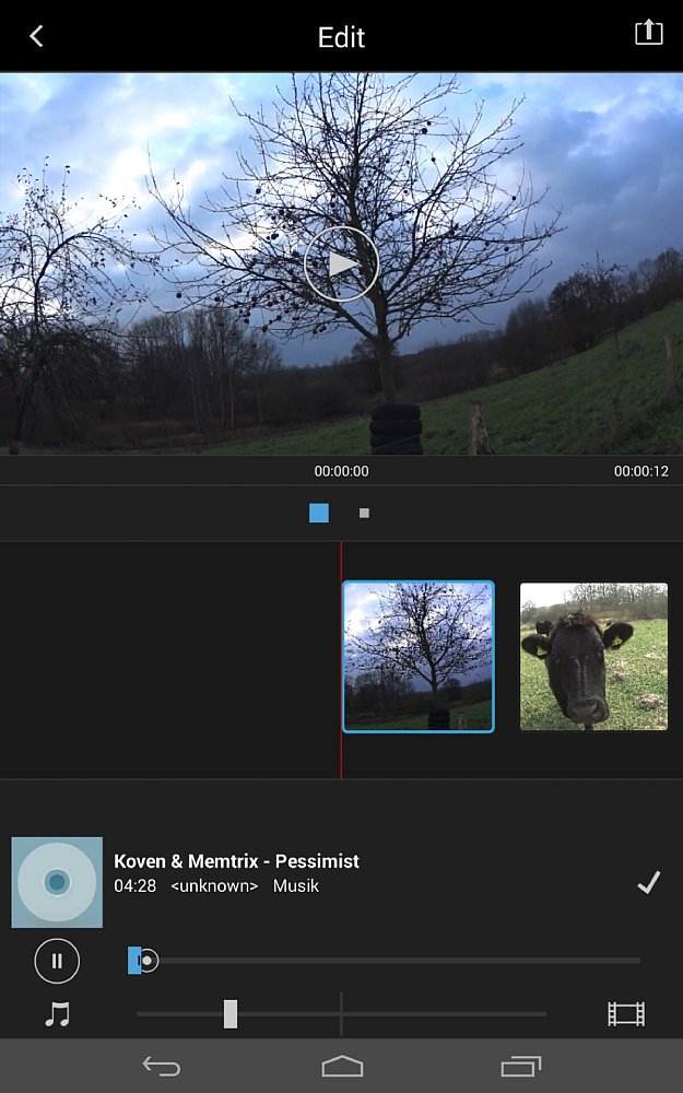 Möchtest du dein Video mit Musik untermalen, kannst du diese aus deiner Musikbibliothek auswählen, die von der Action Cam App schnell eingelesen wird. Da es allerdings keine Suchoption gibt und das Scrollen durch mehrere Tausend Titel viel Zeit einnehmen kann, solltest du dich für ein Stück entscheiden, dass du entweder kürzlich deiner Sammlung beigefügt hast oder in alphabetischer Sortierung relativ weit am Anfang findest. Hast du dich für einen Musiktitel entschieden, kannst du bei Bedarf etwas vom Beginn wegschneiden, um die richtige Einstiegsstelle vorzugeben, und mit einem Schieberegler Video- und Musik-Ton ziemlich genau abmischen. Falls du also das Gescheppere der Actioncam-Mikros nicht im Vordergrund haben möchtest, kannst du es unkompliziert hinter der Musikkulisse verbergen. Leider wird die Musik am Ende des Videos abrupt abgeschnitten – ein sanfter Fade-Out ist nämlich nicht integriert.