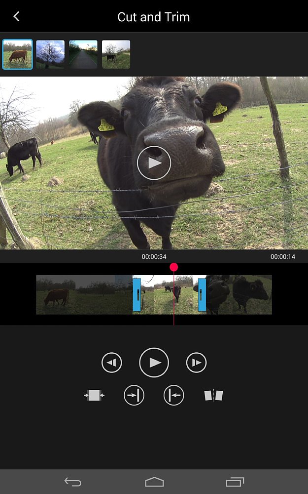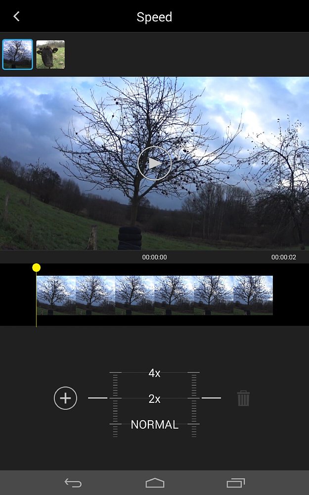 Hast du dein Material aus der Galerie oder direkt von der Kamera importiert, kannst du es mit den einigen Grundfunktionen bearbeiten. Du hast die Möglichkeit, mit einem Schnittwerkzeug Anfang und Ende des Clips frame-genau zu kürzen. Auch kannst du das Material an einer gewünschten Stelle in zwei Clips auftrennen, um sie beispielsweise in der übergeordneten Ansicht neu anzuordnen. Der Cursor ist glücklicherweise sehr präzise und leicht zu bewegen. Die Videovorschau ist überwiegend flüssig und hochauflösend, stockt jedoch bei Bildwiederholraten ab 60 fps (und höher). Du kannst deine Clips um 180 Grad drehen oder senkrecht spiegeln sowie die Geschwindigkeit reduzieren oder erhöhen, was du sogar auf einzelne Ausschnitte anwenden kannst – du kannst also (ohne zu schneiden) in einem Clip mehrere unterschiedliche Tempi haben. Negativ fällt beim Bearbeiten leider auf, dass die App-Oberfläche nicht gedreht werden kann (das wäre auf großen Bildschirmen vorteilhaft) und keine sanften Bildübergänge oder Einblendungen (z. B. für den Videostart) möglich sind. Auch wäre eine Speicherfunktion nicht verkehrt – die Action Cam App läuft zwar sehr stabil und äußerst flüssig (Ausnahme: hohe Bildwiederholraten), wenn sie dennoch mal abstürzen sollte, sind deine Fortschritte verloren.