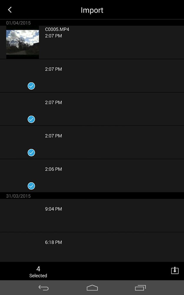 Wenn du ein neues Video-Projekt mit der Action Cam App beginnen möchtest, hast du entweder die Möglichkeit, dein Material direkt von deinem Mobilgerät zu importieren (sämtliche Verzeichnisse werden rasch gescannt, anschließend erfolgt eine Auflistung nach Erstelldatum) oder deine Sony Actioncam hinzuzuziehen und die Clips aus ihrem Speicher herunterzuladen. Du erhältst also Einblick in ihren Speicher, kannst jedoch kein Livebild empfangen, um bei Bedarf neues Material anzufertigen. Zu diesem Zweck musst du weiterhin entweder die Armband-Fernbedienung oder die Sony PlayMemories App verwenden. Wenn du keine Actioncam von Sony besitzt, ist dies allerdings auch kein Problem, denn die Action Cam App akzeptiert sämtliche gängigen Videoformate und sperrt sich nicht gegen alles, das nicht von einer Sony-Kamera kommt (wie es beispielsweise GoPro-Software tut). Einzig 4K-Videos wirst du im Normalfall nicht bearbeiten können. Beim Versuch, diese zu importieren, dürftest du häufig mitgeteilt bekommen, dass der Import durch die technischen Limitationen deines Mobilgeräts verhindert wird. Wenn dein Smartphone/Tablet also keine 4K-Videos anzeigen kann, wird es diese App auch nicht tun.
