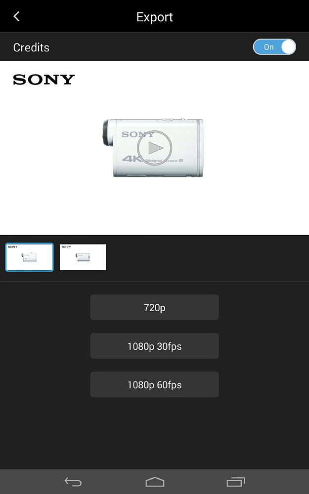 Wenn du deinen Clip anschließend exportieren möchtest, kannst du eine Auflösung zwischen 720p mit 30 Bildern/s und 1080p mit 30 oder 60 Bildern/s aussuchen. Wir haben Aufnahmen unterschiedlicher Actioncams vermischt und problemfrei exportieren können. Optional sind beim Export „Credits“. Du kannst von der App eine Einblendung vor dem eigentlichen Video vornehmen lassen, die eine Sony-Actioncam zeigt und mit dem typischen Aufnahmestart-Sound in deinen Zusammenschnitt überleitet. Du kannst diese Funktion natürlich deaktivieren, falls du jedoch ein nettes Intro haben möchtest, könnte das Angebot vielleicht nützlich sein. Leider darfst du dein Video beim Export nicht selbst benennen und auch die Wahl eines Zielverzeichnisses kannst du nicht verändern.