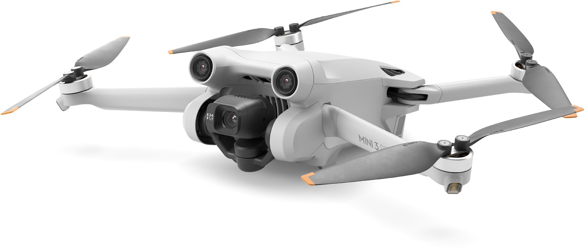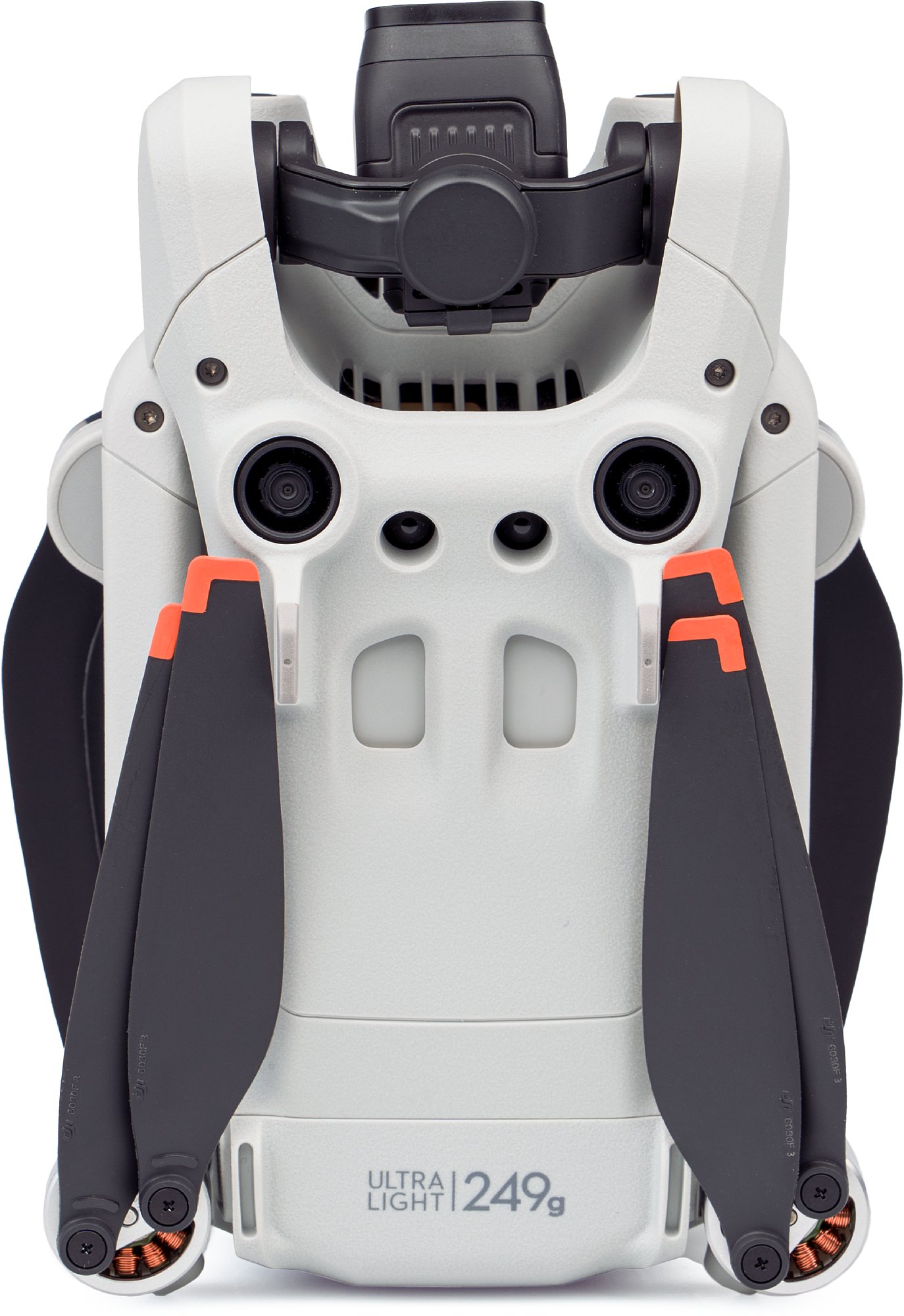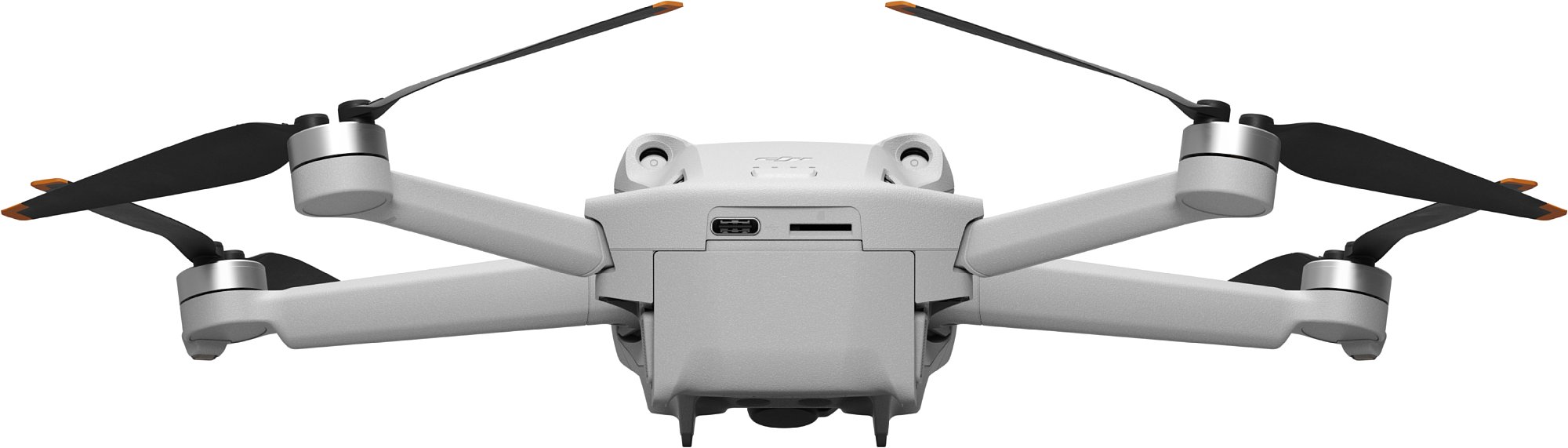Ein richtiges Landegestell hat die DJI Mini 3 Pro nicht, so wie praktisch alle Mini-Drohnen. Zwei kleine Standfüße befinden sich zentral unter dem Gehäuse, zwei weitere am Akku. An den Propeller-Armen befinden sich keine Füße. An den vorderen Armen sitzen LEDs, die nach vorne strahlen. Weitere im Flug sichtbare LEDs gibt es nicht. Nach vorne, hinten und unten sind zudem jeweils zwei Kollisionsvermeidungs-Sensoren. Besonders die nach vorne gerichteten sind auffällig, quasi die Augen im Gesicht der Mini 3 Pro. Auf der Rückseite befindet sich ein USB-C-Anschluss zum Aufladen des internen Akkus sowie ein Steckplatz für eine MicroSD-Karte. 1,2 GB interner "Not-Speicher" ist übrigens in der Drohne selbst noch verbaut. Sollte man also die Speicherkarte vergessen haben oder sie voll sein, hat man zumindest noch etwas Reserve für Fotos oder knapp 2 Minuten 4K-Videos.