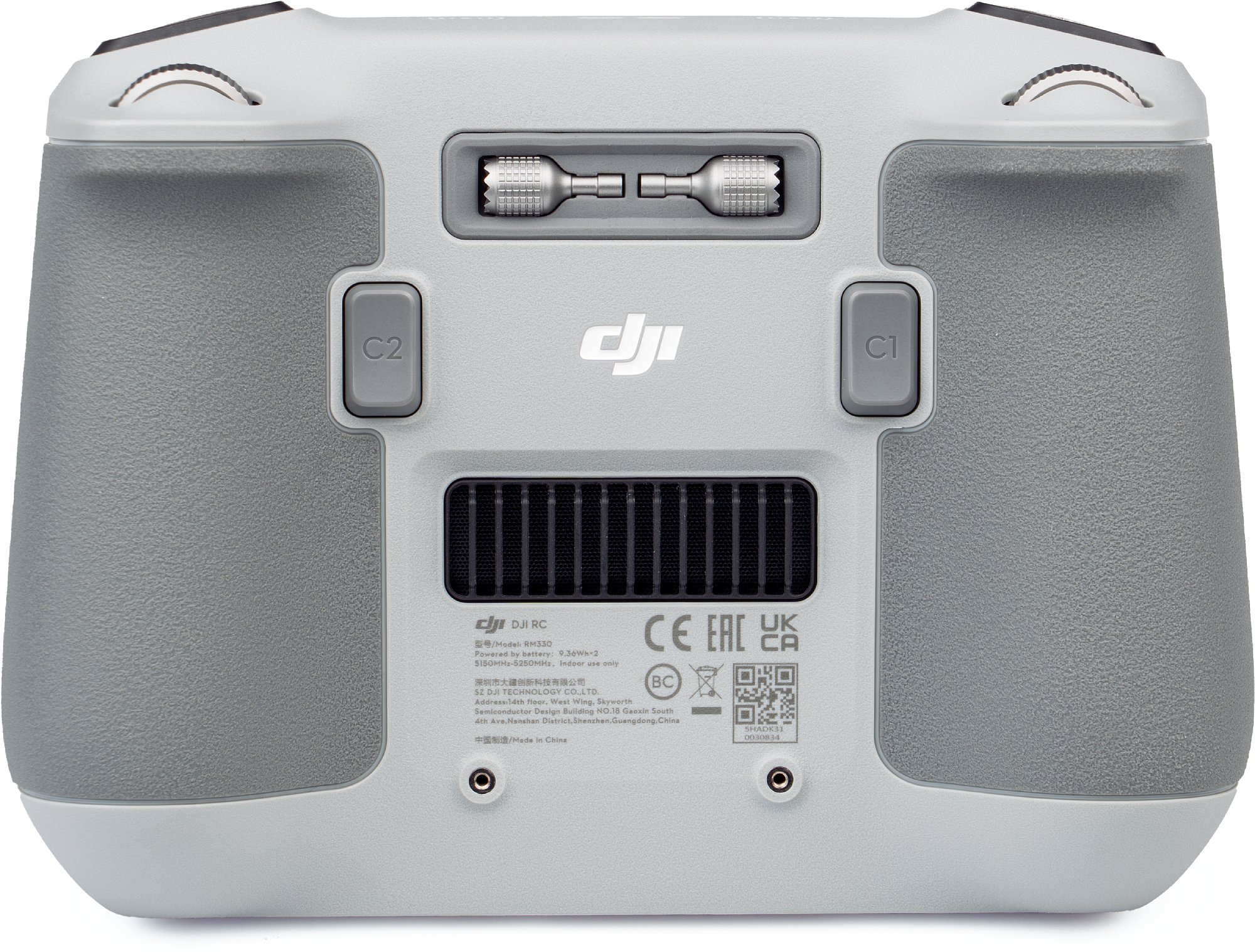 Der neue DJI RC Controller besitzt gegenüber dem bekannten RC-N1 Controller einige zusätzliche Bedienelemente: Video-Start-Stopp und Fotoauslöser sind nun getrennt und darunter gibt es zwei Drehräder. Zudem zwei Funktionstasten C1 und C2 auf der Unterseite. Der Griffbereich ist rutschfest gummiert. An der Vorder- und Unterseite sind insgesamt vier Gewinde zum Montieren von Zubehör eingelassen. Zudem gibt es auf der Vorderseite unter einer Klappe einen Host-USB-C-Anschluss (geladen wird der Controller über die separate, offenliegende Schnittstelle) und einen Steckplatz für eine Micro-USB-Karte.
