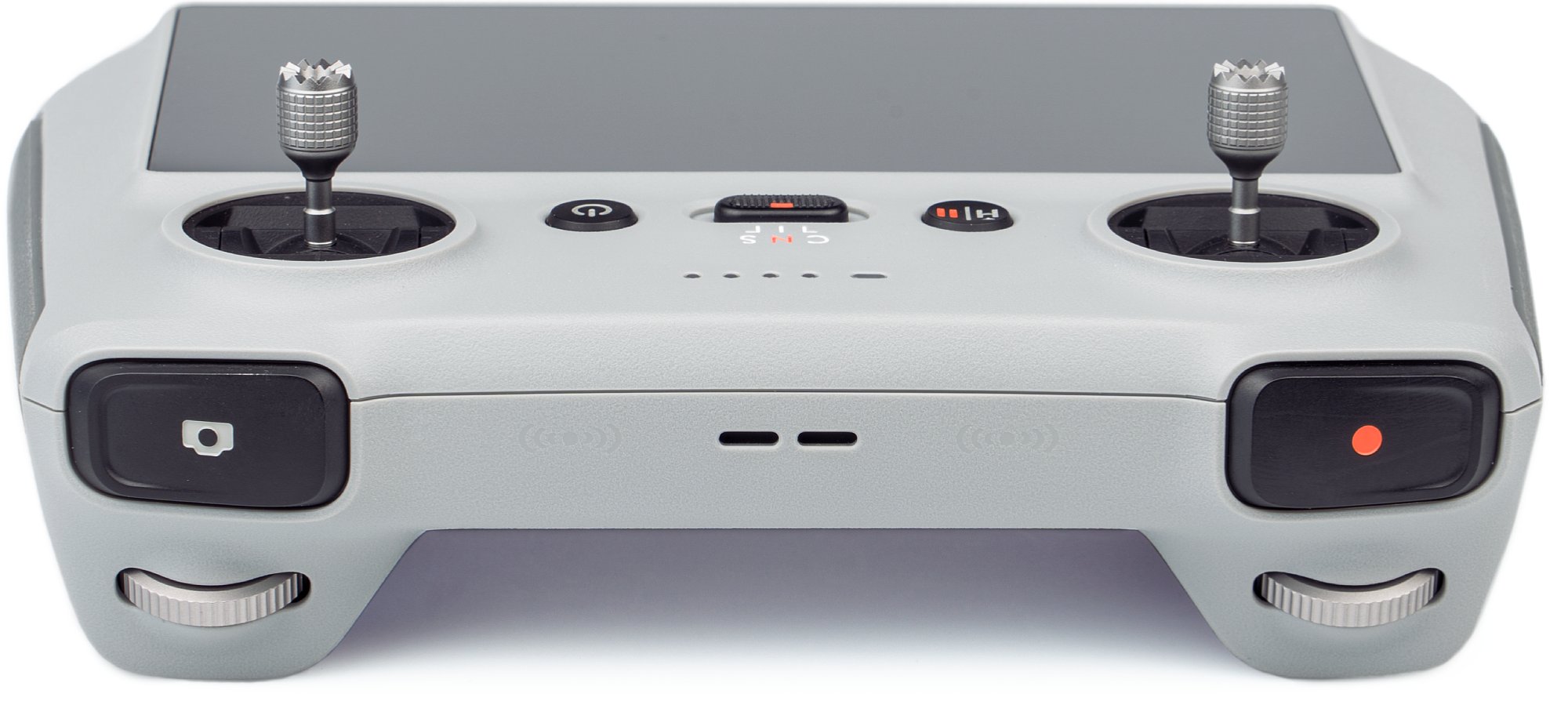 Der neue DJI RC Controller besitzt gegenüber dem bekannten RC-N1 Controller einige zusätzliche Bedienelemente: Video-Start-Stopp und Fotoauslöser sind nun getrennt und darunter gibt es zwei Drehräder. Zudem gibt es zwei Funktionstasten C1 und C2 auf der Unterseite. Der Griffbereich ist rutschfest gummiert. An der Vorder- und Unterseite sind insgesamt vier Gewinde zum Montieren von Zubehör eingelassen. Zudem gibt es auf der Vorderseite unter einer Klappe einen Host-USB-C-Anschluss (geladen wird der Controller über die separate, offen liegende Schnittstelle) und einen Steckplatz für eine Micro-SD-Karte.