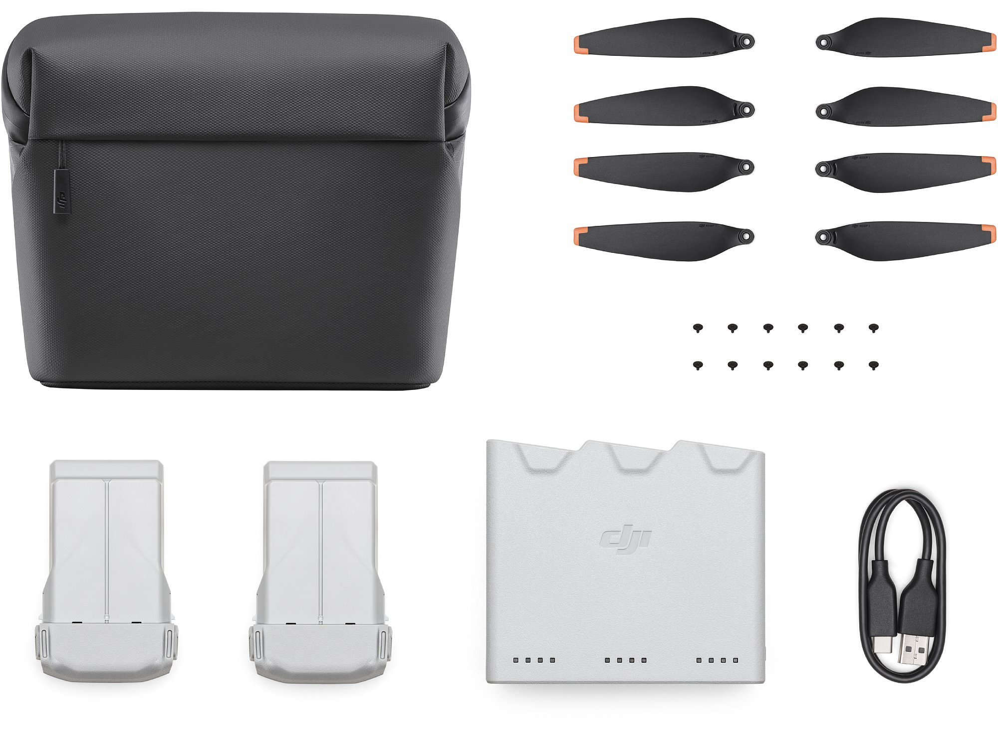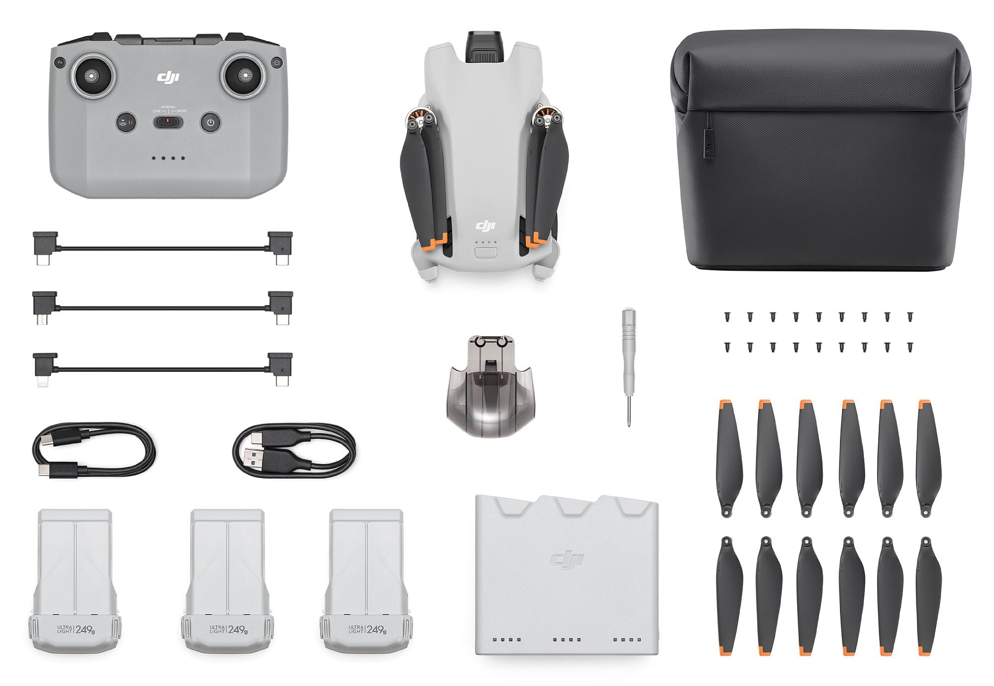 Bei den verschiedenen Ausstattungspaketen hat DJI sozusagen eine Rolle rückwärts gemacht – zurück zu den altbewährten Fly More Combos. Aus diesem Konzept war der Hersteller bei der Mini 3 Pro kurz ausgeschert. Die "Pro" gibt es ohne Fernsteuerung, mit einfacher Fernsteuerung sowie mit Display-Fernsteuerung und wer mehr Akkus, eine Tasche und die Ladeschale haben wollte, konnte das separate Fly More Set dazukaufen.