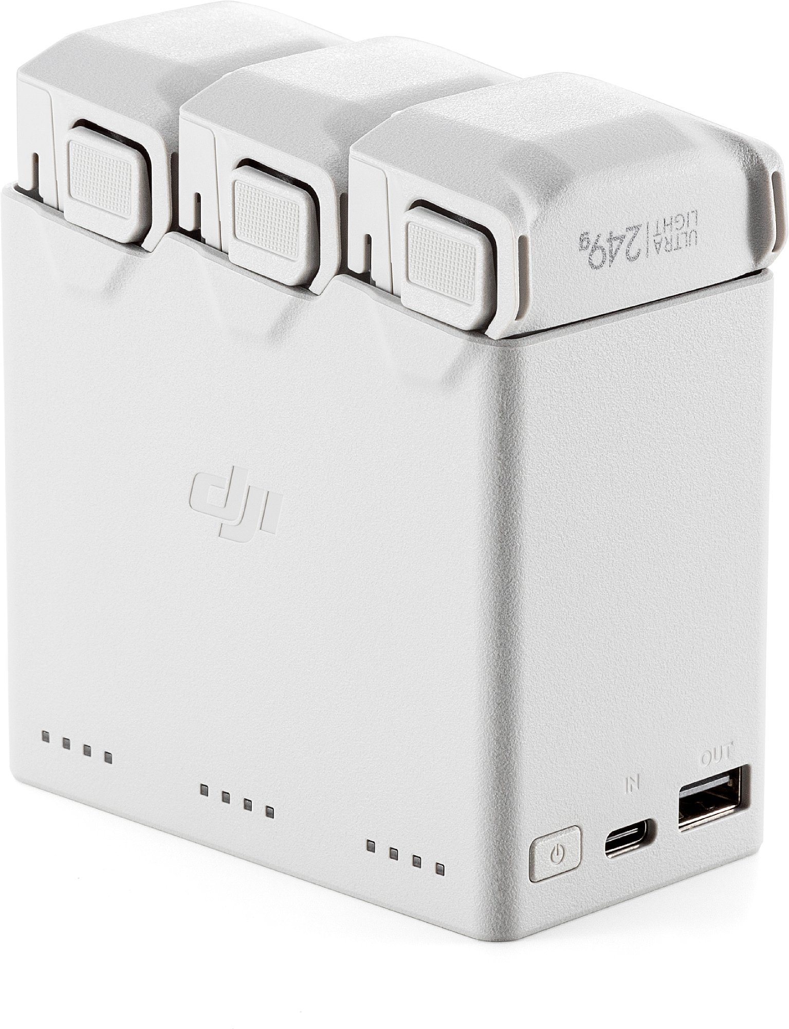 Die Ladeschale wiederum ist prima konzipiert. Sie ist schön kompakt und mit einem USB-C-Port zum Laden ausgestattet, wie auch die DJI Mini 3. Beim Standard-Lieferumfang wird der Akku auch einfach in der Drohne geladen. Ein USB-C-auf-USB-C-Kabel wird mitgeliefert, ein Ladegerät nicht. Ein 30-Watt-USB-C-Ladegerät gibt es von DJI für 19 Euro als Zubehör. Es lässt sich aber auch jedes bestehende Ladegerät mit Power Delivery nutzen, z. B. vom Smartphone oder Laptop. Von dessen Leistung abhängig ist übrigens die Ladedauer: mit einem potenten Ladegerät ist einer der Akkus in rund einer Stunde voll. Danach wird direkt der nächste geladen. Alle drei Akkus sollten dann in weniger als drei Stunden wieder voll sein, denn man kommt ja normalerweise nicht mit vollständig leeren Akkus zurück. Mit einem leistungsschwächeren Ladegerät dauert es teilweise erheblich länger, beispielsweise die ganze Nacht.