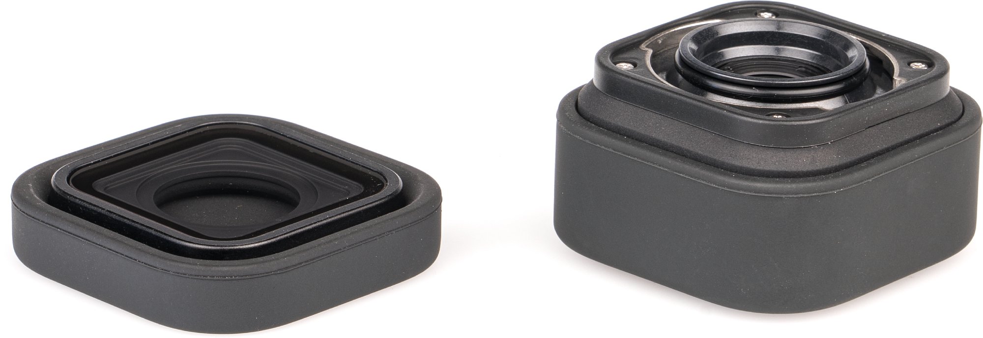 Befestigt wird das Max Lens Mod einfach mit einem Bajonett. Hierzu entfernt man die Original-Linsenabdeckung durch eine Vierteldrehung gegen den Urzeigersinn. Zum Vorschein kommt dann die ebenfalls schon deutlich gewölbte Frontlinse der Hero10 (oder Hero9), die sich normalerweise hermetisch abgeschlossen hinter dem Schutzglas befindet. Dass man das Schutzglas so einfach abnehmen kann, wussten wir gar nicht. Bei den älteren GoPro-Modellen (vor Hero8) funktioniert dieser "Trick" so auch nicht.