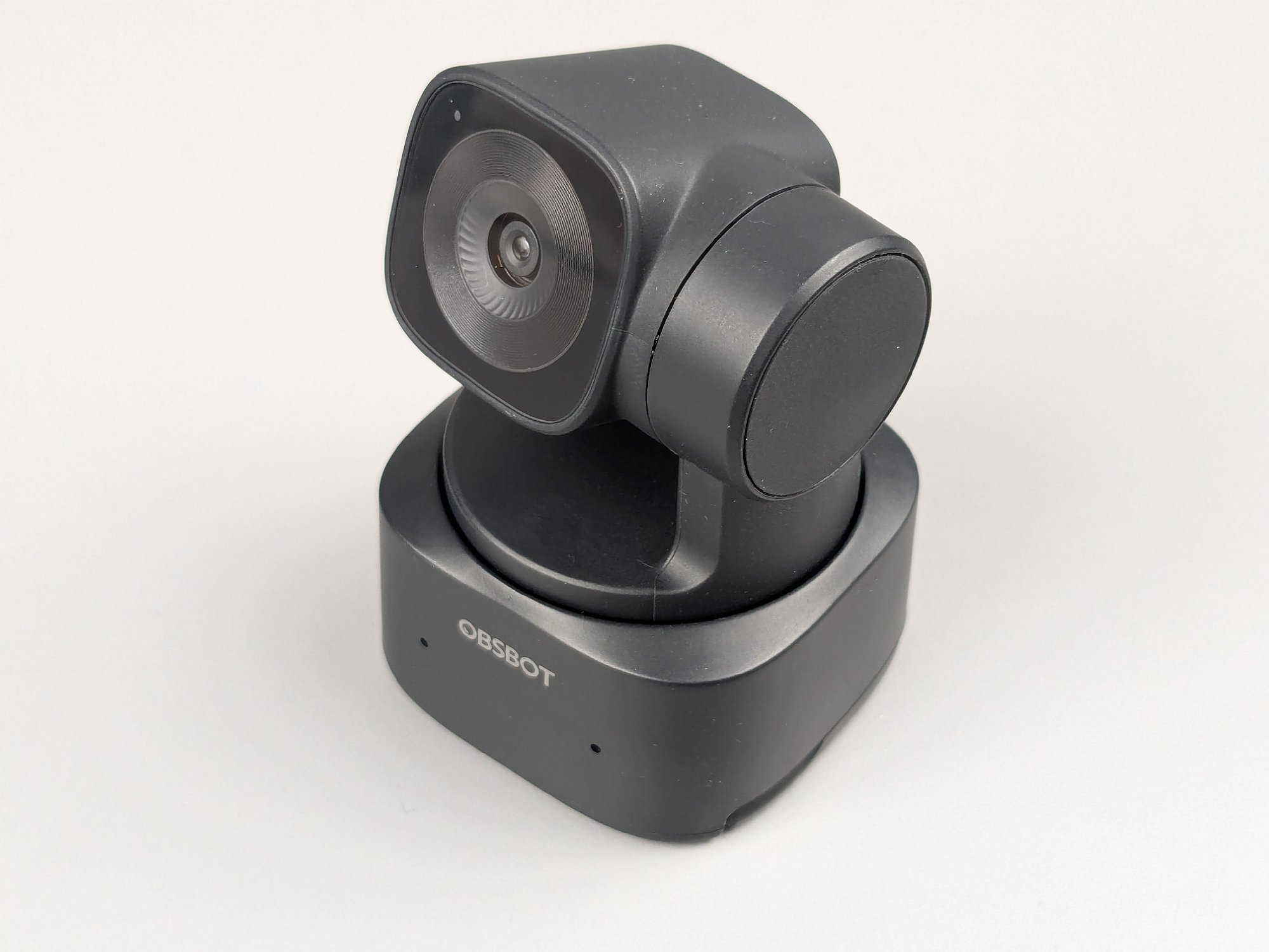 Im Sockel der Kamera sind zwei Öffnungen für Mikrofone unten links und rechts, von denen in unserem Test nur das linke funktionierte (es ist aber auch nirgendwo von einem Stereomikrofon die Rede). Auf der Rückseite sitzt eine USB-C-Buchse und oben auf dem Sockel der Gimbal mit der schwenkbaren Kamera. Diese besitzt eine mehrfarbige LED, mit der sie ihren Status signalisiert.