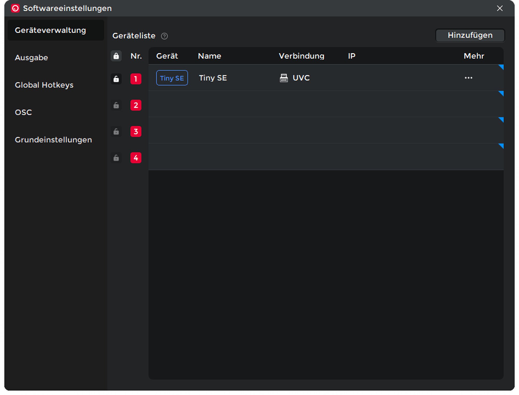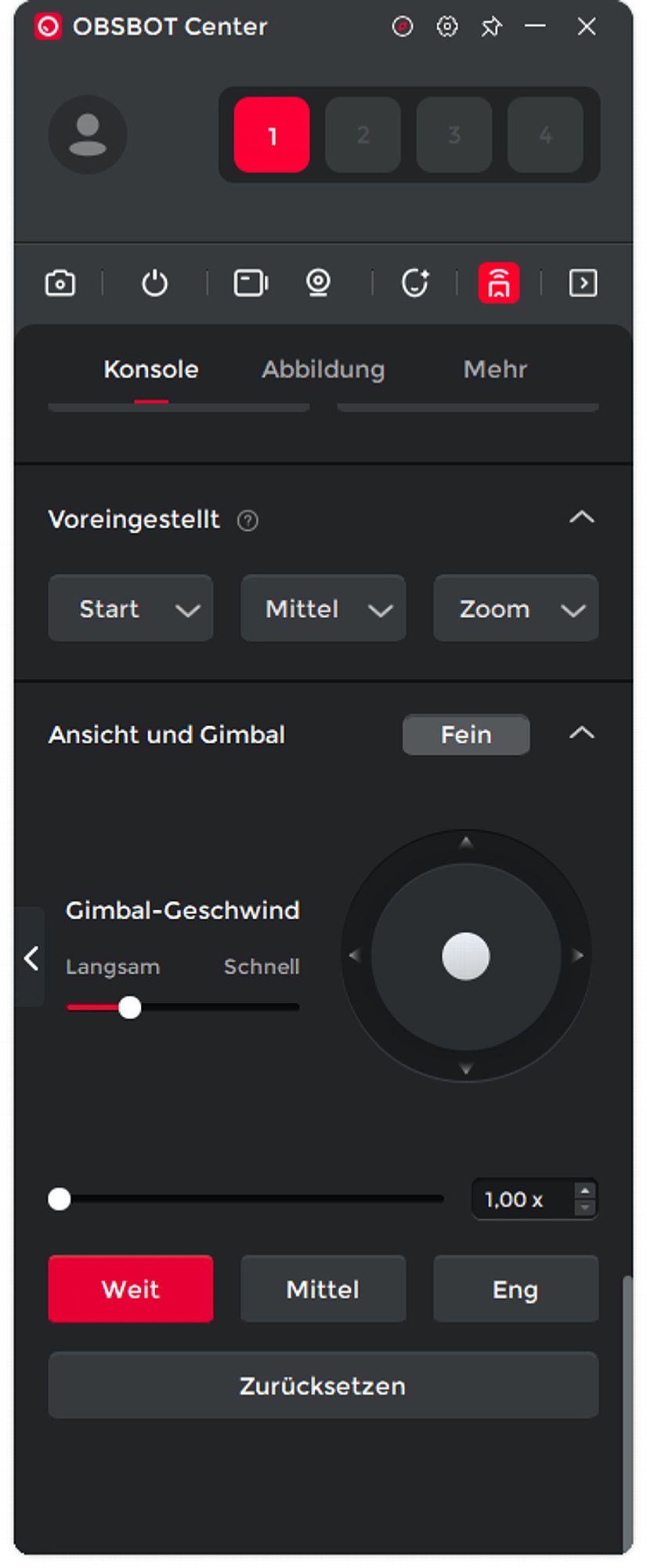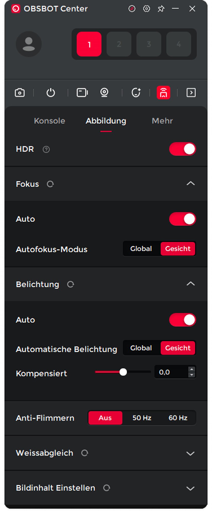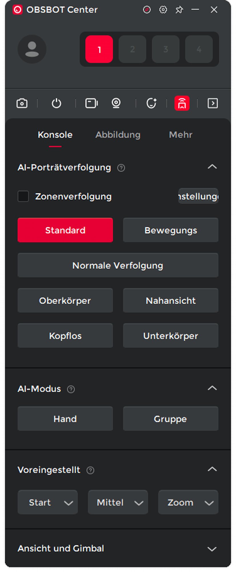 Die Software OBSBOT Center ist unglaublich mächtig. Sie kann bis zu vier OBSBOT-Kameras einstellen und steuern, einschließlich der Gimbals der diversen Gimbal-Kameras oder der "virtuellen Gimbals" der Kameras der OBSBOT Meet-Serie. Für die Tiny SE gibt es zahllose Einstellungen, von der Auflösung und Bildfrequenz, der Ausrichtung (Querformat oder Hochformat, hier vom Englischen wörtlich mit Landschaft und Porträt übersetzt), der Bitrate und anderen zahlreichen Grundeinstellungen.