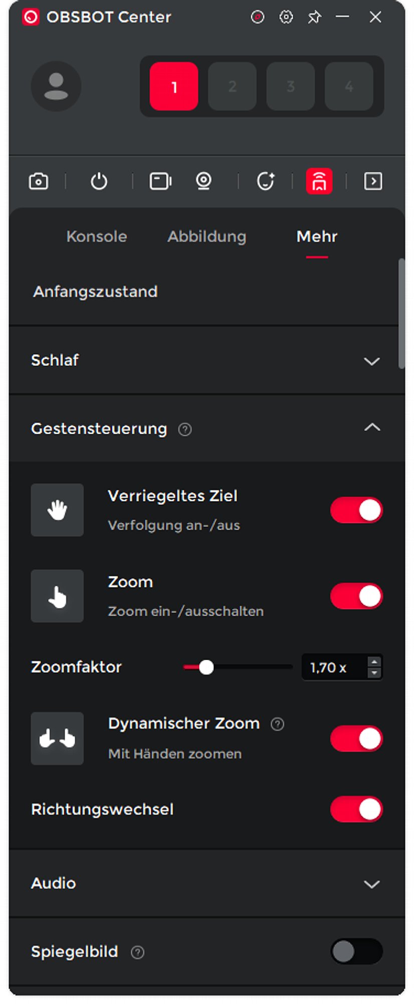 Dazu gibt es mehrere Fenster für die Kamerasteuerung, wo sich unter anderem das Auto-Framing ein- und ausschalten lässt. Zudem kann man noch beeinflussen, wie sich das Auto-Framing verhalten soll (Gruppenmodus, Oberkörper oder Nahaufnahme). Für das Zoom stehen hier insgesamt noch eine weitere Zoomstufe, alternativ zwei verschiedene, sehr moderate Zoomstufen (1,25x und 1,5x) direkt per Schnelltaste zur Verfügung und ein Zoomregler in 0,25x-Stufen bis maximal 4-fach-Zoom. Es lassen sich sogar drei beliebige Kombinationen aus Kameraausrichtung und Zoom abspeichern, also drei bestimmte Positionen, die man dann mit einem Knopfdruck jederzeit direkt ansteuern kann. Da bleiben also keine Wünsche offen.