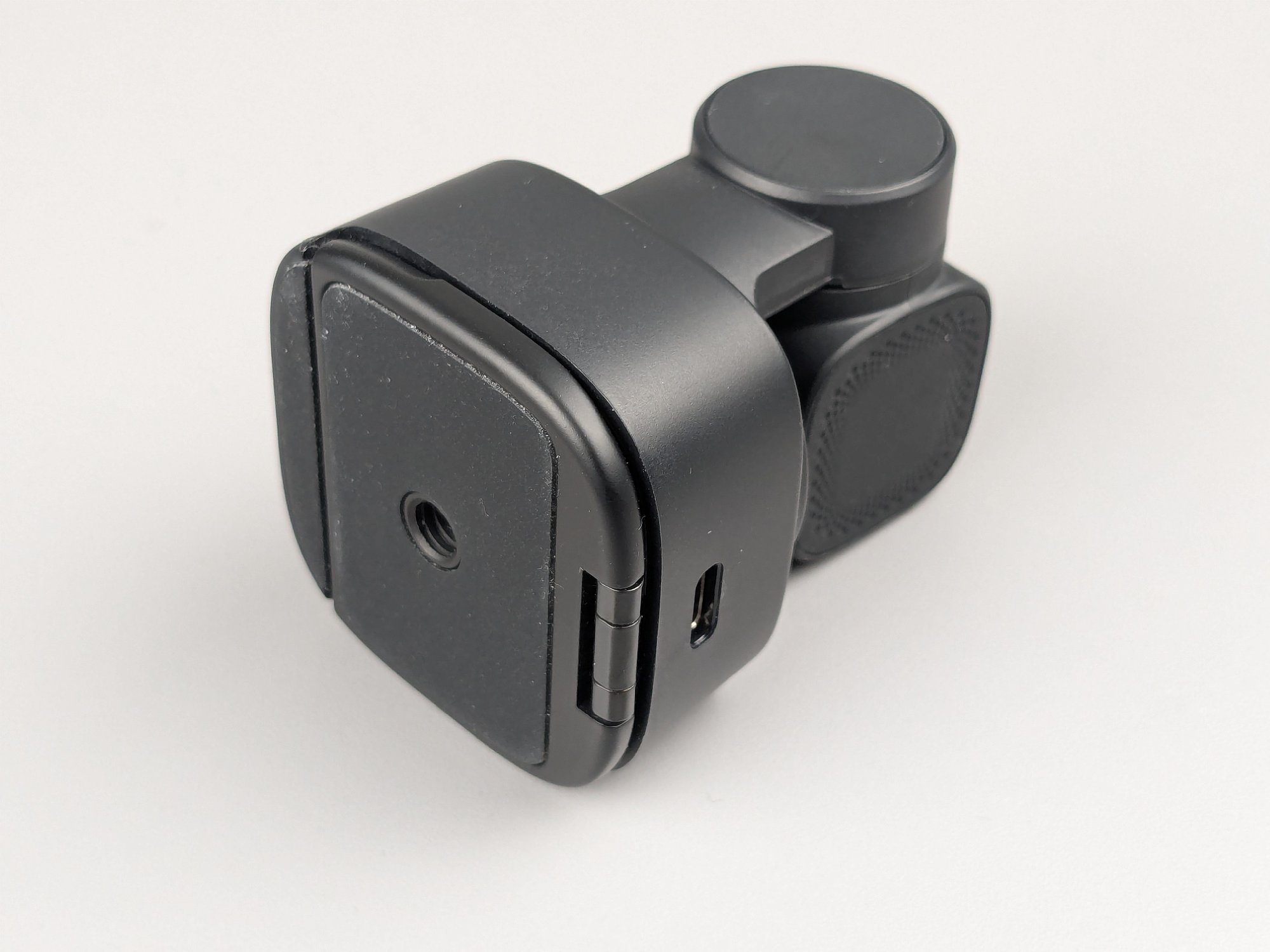 Das Gehäuse der OBSBOT Tiny 2 SE ist so konstruiert, dass es frei auf einer Oberfläche aufgestellt werden kann, die Unterseite ist entsprechend griffig gummiert. Alternativ lässt sich der größte Teil der Unterseite wegschwenken, wodurch die Kamera auch einfach auf einen Monitor gesetzt und durch den richtigen Winkel der dann abgewinkelten Bodenplatte waagerecht ausgerichtet werden kann. Als dritte Aufstellmöglichkeit hat die Bodenplatte auch noch ein 1/4-Zoll-Stativgewinde in der Bodenplatte. Da diese nicht besonders dick ist, reichte es nur für ein paar Gewindegänge. Weil die Kamera aber nicht einmal 100 Gramm wiegt, reicht das zur Befestigung auf einem Stativ allemal.