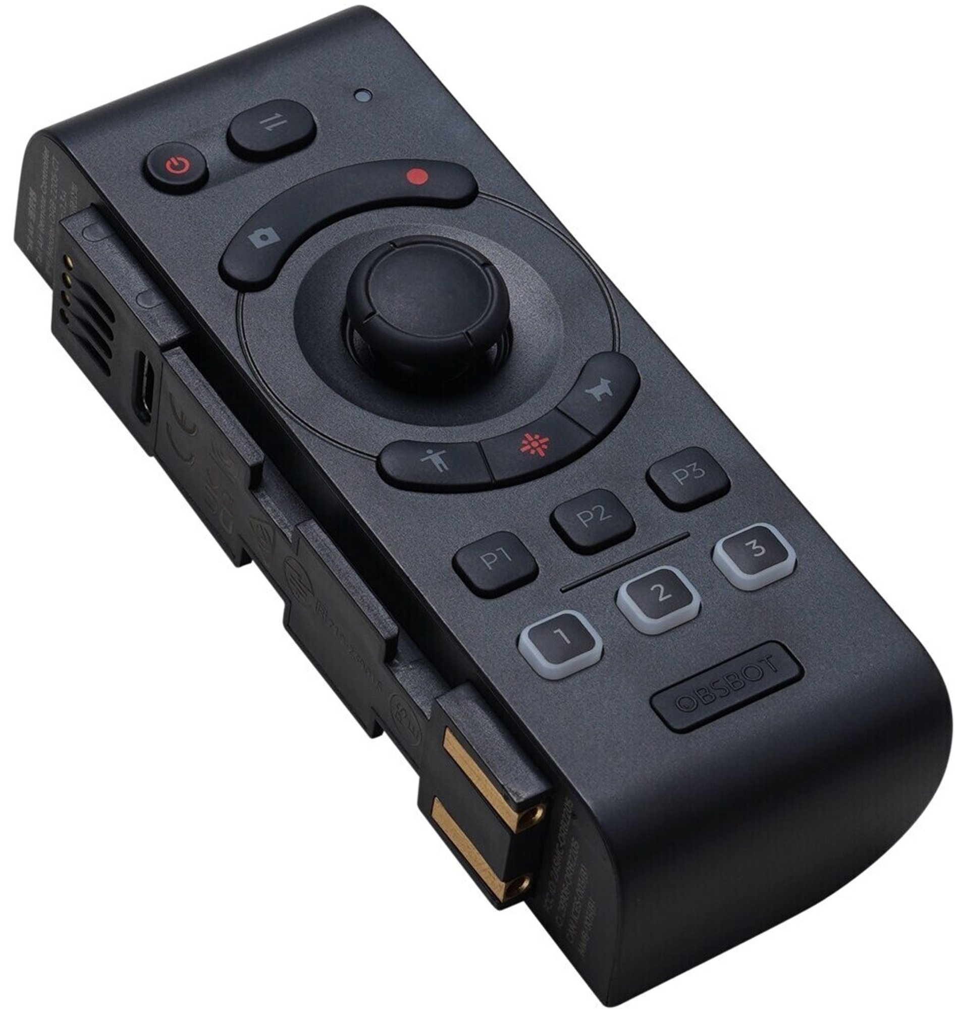 Die Fernsteuerung hat auf der linken Seite mysteriöse Kontakte und eine Mechanik, die darauf hindeutet, dass man diese Fernsteuerung in irgendein anderes Gerät einklinken kann. Ein passendes Gerät konnten wir allerdings nicht finden und haben bei Obsbot nachgefragt, was es damit auf sich hat. Tatsächlich ist wohl geplant, dass die Fernsteuerung in einer zukünftigen Version des Obsbot Talent eingerastet werden kann. Obsbot Talent ist ein Live-Streaming-Gerät, das sich drahtlos oder per Kabel mit Kameras verbindet und über das man dann praktisch den Live-Videoschnitt und das Streaming steuert. Im Grunde von der Funktionalität etwa wie ein Blackmagic ATEM Mini, allerdings rein Touchscreen-basiert, ganz ohne „echte“ Tasten und Knöpfe. Eine künftige Version davon kann man dann offenbar um den Remote-Controller erweitern, indem man diesen einfach seitlich andockt.
