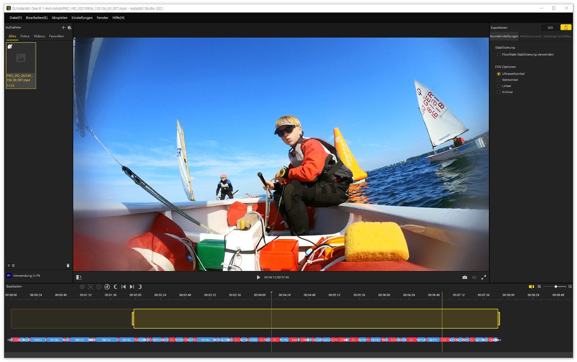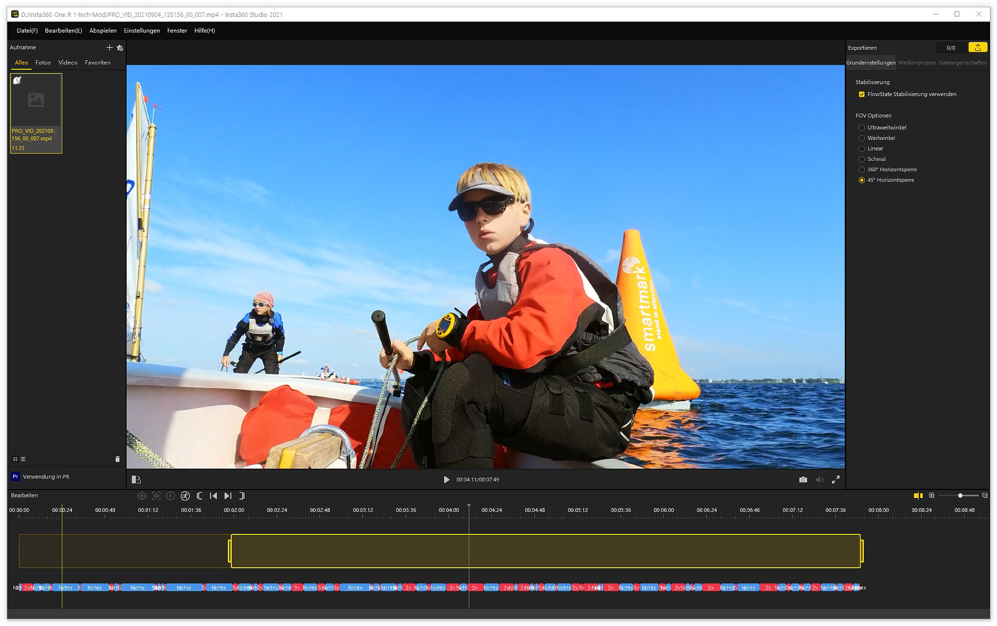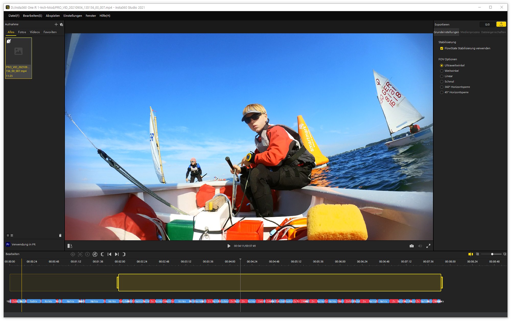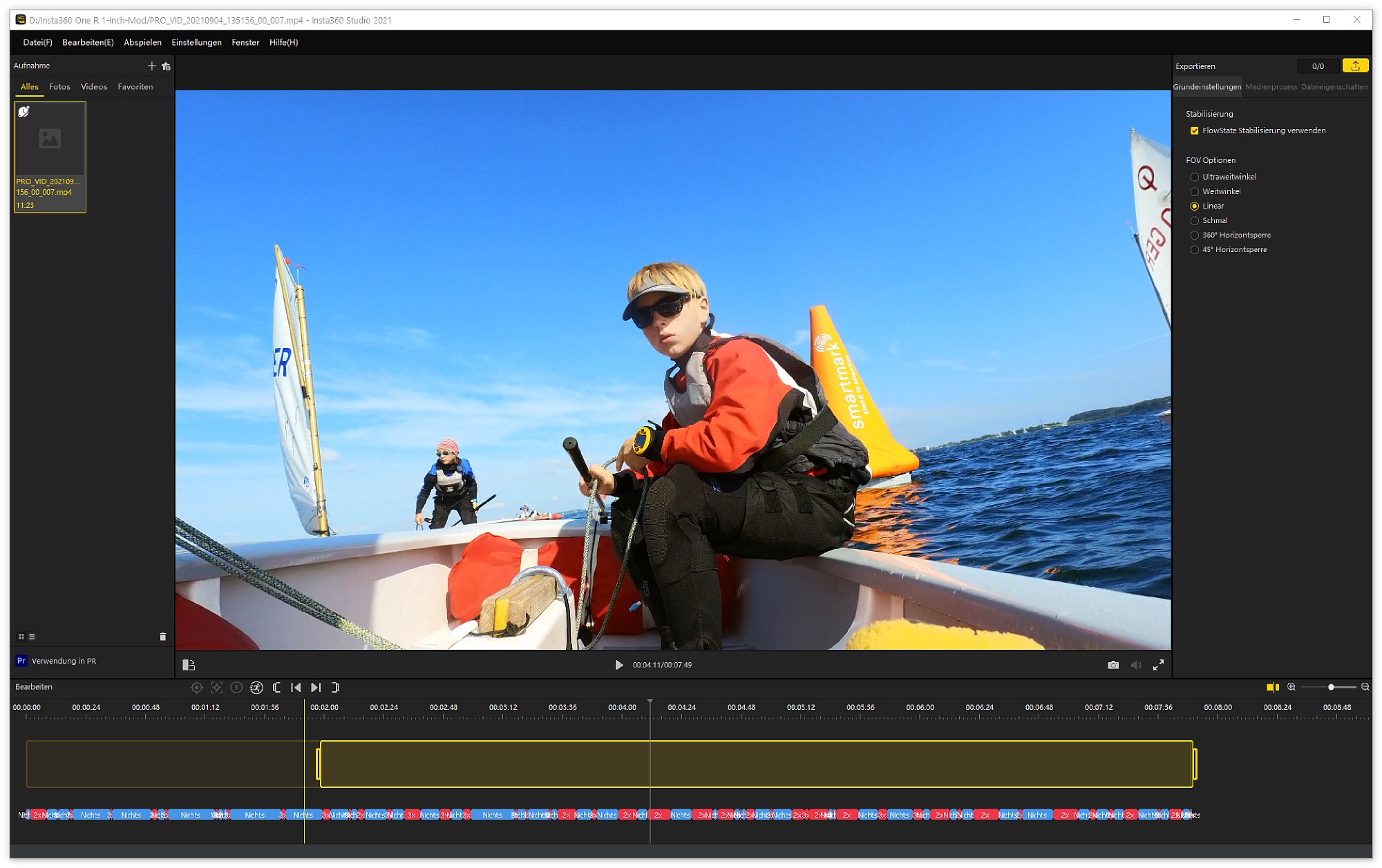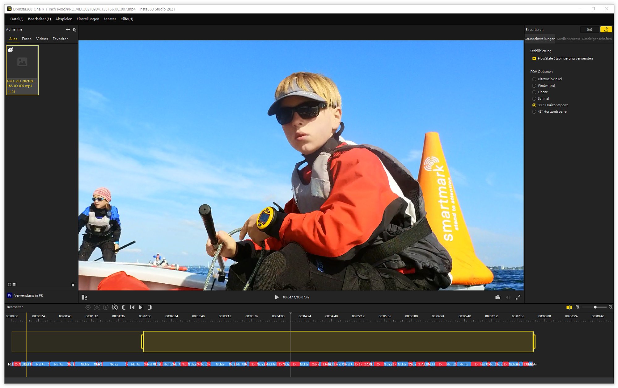 Nachträgliche Bildbearbeitung im Smartphone oder Desktop-App Der Verarbeitung der Aufnahmen im Smartphone geht scheinbar in Windeseile. Tatsächlich zeigt das Smartphone heruntergeladene Videos sofort mit Horizont-Verriegelung an, wenn diese bei der Aufnahme eingestellt wurde. Damit das funktioniert, speichert die Insta360 One R parallel zum "richtigen" Video immer eine sehr viel kleinere, so genannte Proxy-Version. Dieses Video in geringer Auflösung ist schnell ans Smartphone übertragen und hat so wenig Bilddaten, dass das Smartphone das Videos direkt fertig anzeigen kann und auf dem kleinen Smartphone-Display sieht das auch gut aus. Für die volle Qualität bzw. Auflösung muss das Video jedoch aufwändig in der Desktop-App neu gerendert werden. Das dauert! Wenn man nicht gerade einen Hochleistungs-Gaming-PC hat, kann man gerne mit der drei- bis vierfachen Zeit der eigentlichen Videospieldauer für die Verarbeitung auf dem PC rechnen. Dafür bekommt man dann aber auch perfekt stabilisierte, perfekt ausgerichtete, hochaufgelöste Videos, die wirklich umwerfend aussehen.