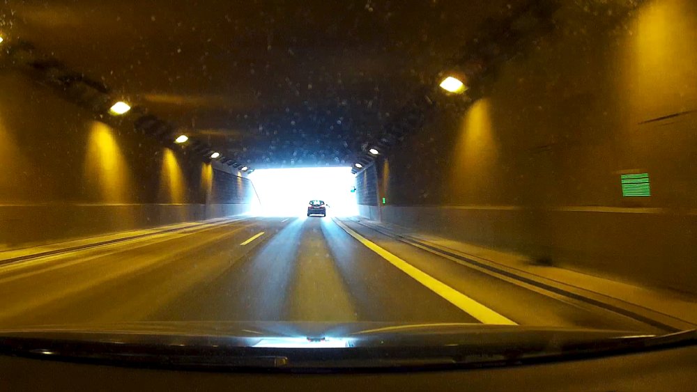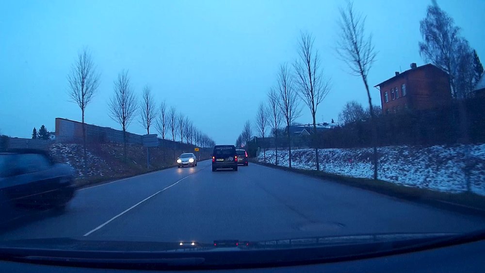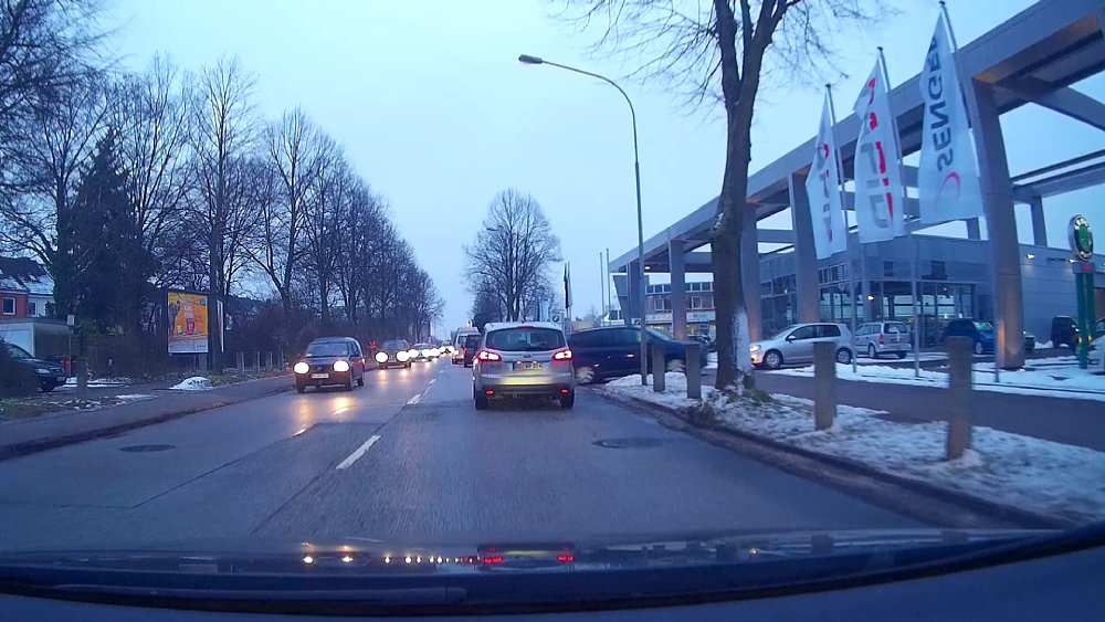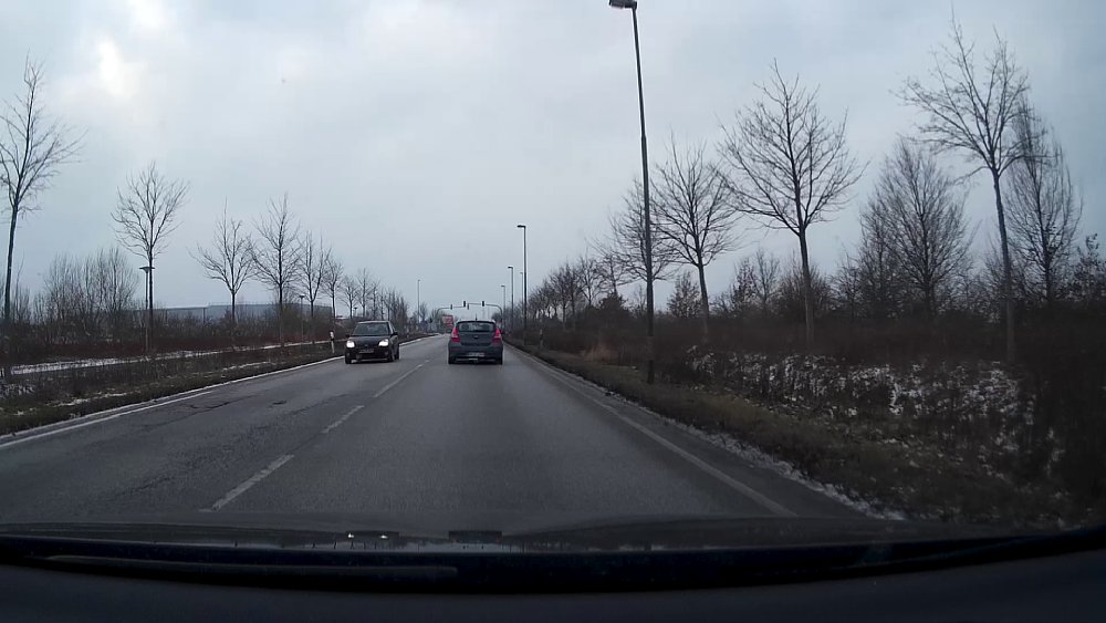 Von der starken optischen Verzerrung abgeseheh, ist die übrige Qualität unserer Testaufnahmen überwiegend brauchbar. Je nach Licht gerieten unsere Testaufnahmen bisweilen etwas zu dunkel und speziell in der Dämmerung lag die Jobo Carcam FullHD beim Weißabgleich mitunter "voll daneben" und zeichnete stark blaustichige Bilder auf. Dies trat verstärkt in dem von uns auch getesteten HDR-Modus, der die Aufnahmen bei schwierigen Belichtungssituationen verbessern soll (und auch tut). Recht gut ist wiederum die Aufnahmeleistung bei wenig Licht. Nach der Einfahrt in einen Tunnel adaptierte die Kamera recht schnell und lieferte auch bei wenig Licht noch brauchbare Videos. Erst bei sehr wenig Licht, also bei Nachtfahrten, kann die Jobo Carcam FullHD aber auch keine Wunder vollbringen, dann nimmt die Bildqualität stark ab. Als Beweissicherungs-Videos sind die Aufnahmen insgesamt aber gut zu gebrauchen und in FullHD auch so scharf, dass auch Nummernschilder gut zu erkennen sind (aus diesem Grund verzichten wir hier auch auf ein Beispielvideo, sondern zeigen statt dessen Screenshots aus den Aufzeichnungen). Um beeindruckende Fahr-Videos, z. B. im Rahmen einer Urlaubsreise, zu machen, würden wir uns eine noch bessere Videoqualität und vor allem ein weniger stark verzeichnendes Objektiv wünschen.