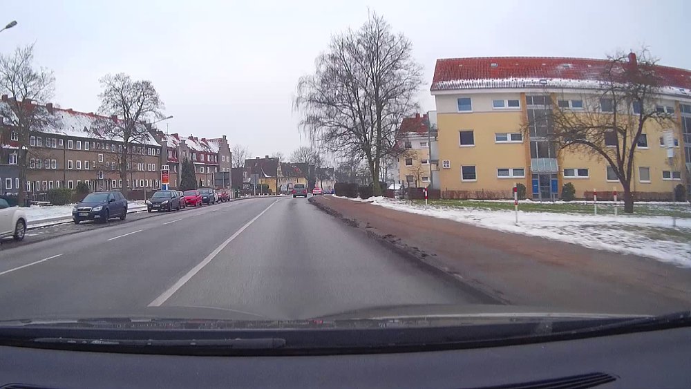 Das Objektiv hat übrigens einen Bildwinkel von 120 Grad (diagonal) bei Aufzeichnung (Foto oder Video) im 16:9-Format. Für die Montage hinter der Windschutzscheibe ist dieser Bildwinkel nahezu ideal. Durch das sehr starke Weitwinkelobjektiv (und das offenbar sehr einfache unkorrigierte Objektiv und die fehlende elektronische Korrektur) haben die Aufnahmen einen extremen Fisheye-Effekt, sie sind stark tonnenförmig verzerrt. Das heißt, Bäume und Häuser am Straßenrand werden stark verbogen aufgenommen und die Windschutzscheibe am unteren Bildrand erscheint umgekehrt herum gebogen. Das sieht nicht schön aus. Für die reine Unfall-Dokumentation ist das in Ordnung, aber wenn du "schöne" Fahrtaufnahmen, beispielsweise als Urlaubserinnerung, machen willst, wirst du mit dem starken Fisheye-Effekt auf Dauer sicherlich nicht glücklich.