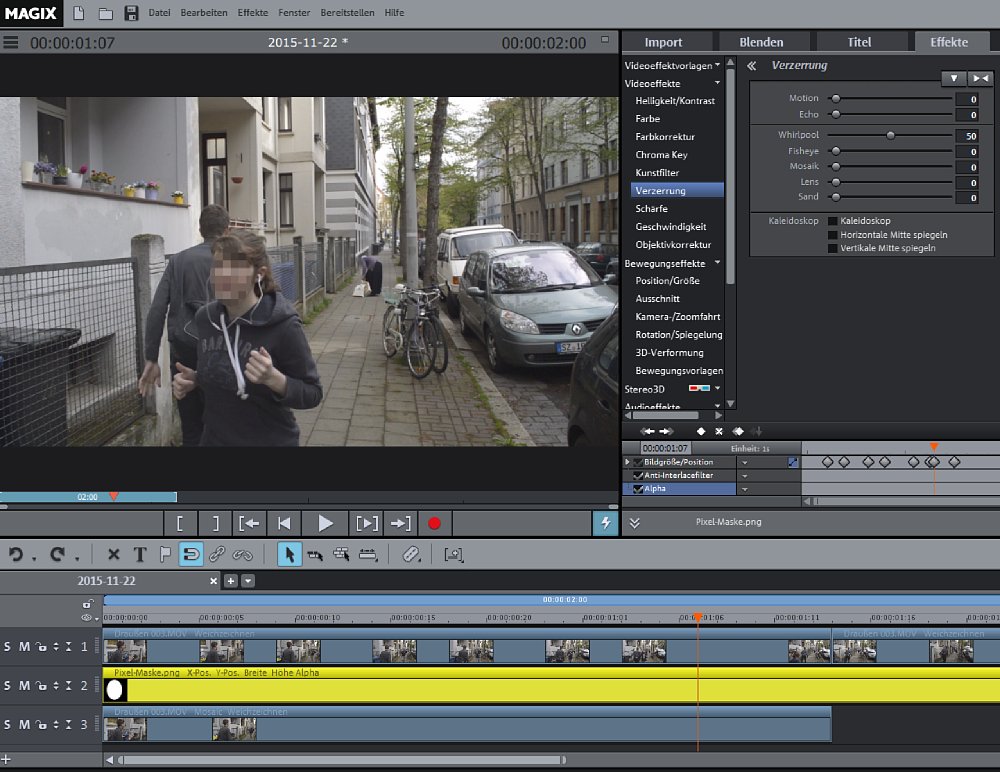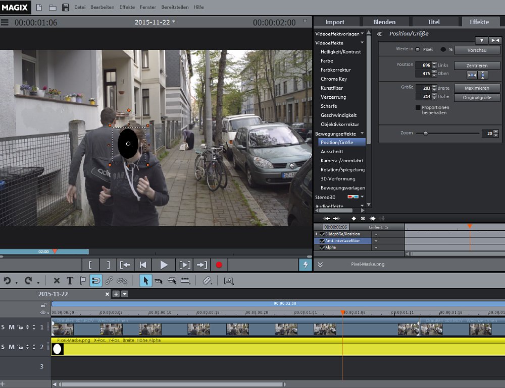 Nun bist du startklar. Im Effekt-Browser siehst du unterhalb der Einstellungen zu „Position/Größe“ eine kleine Zeitleiste, auf der der Effekt gleichnamig vermerkt ist (zusammen mit Alpha und Anti-Interlacefilter). Hier werden alle von dir angewandten Effekte dargestellt. Über der kleinen Zeitleiste sind ein paar Symbole zu finden. Wichtig für dich ist die alleinstehende Raute. Drückst du auf den Button, erscheint auf der kleinen Zeitleiste ein identisch aussehendes Pendant. Das ist ein Keyframe. Mit Keyframes kannst du Eckpunkte einer Animation festlegen und das Programm füllt alle Zwischenschritte selbstständig aus. Gehe nun in der großen Zeitleiste (also bei deinem Videomaterial) vor bzw. zurück bis zu einem Punkt, an dem die Maske das Gesicht/Objekt nicht mehr abdeckt – wenn sich also das Objekt oder die Person bewegt hat. Ziehe nun die Maske wieder auf das Gesicht und Magix Video Deluxe setzt automatisch einen neuen Keyframe. Wenn du den Abschnitt zwischen den Keyframes betrachtest, siehst du, dass sich die Maske mit dem Gesicht/Objekt mitbewegt. Setze die Verfolgung des Objekts/Gesichts auf diese Weise fort, bis die Maske die gesamte Zeit über sauber an der von dir gewünschten Stelle sitzt.
