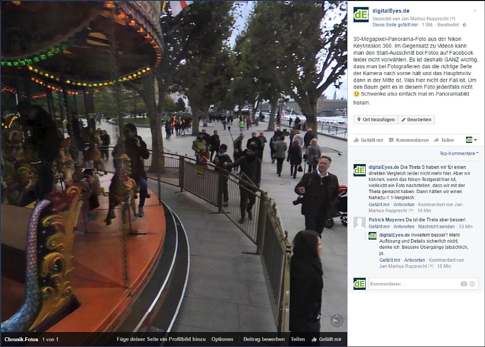 "Schuld" an der Misere sind sowohl Facebook als auch Nikon. Facebook "kennt" die KeyMission 360 noch nicht und weiß nicht, dass Fotos von dieser Kamera (die ja in den Exif-Daten angegeben ist) Panorama-Fotos sind. Und Nikon hat es versäumt, in den Exif-Daten das aufschlussreiche Feld "Projection Type" mit dem Wert "equirectangular" mit anzugeben, das Facebook die Information geben würde, dass es sich um ein equirektangular projiziertes Panorama-Foto handelt, das sinnvollerweise im Panorama-Viewer angezeigt werden sollte.