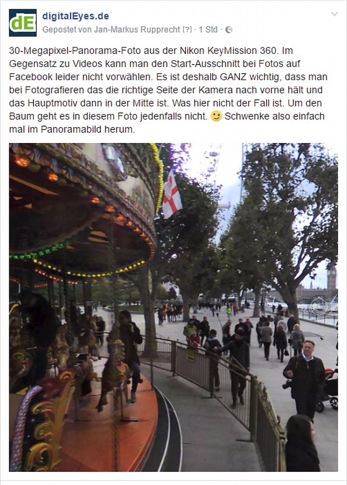 Vielleicht schreibt Nikon in der nächsten Firmware-Version der KeyMission 360 den Parameter standardmäßig in die Bilddateien – oder Facebook nimmt zur Kenntnis, dass Fotos aus einer KeyMission 360 (der Kameraname steht ja auch in den Exif-Daten) immer Panorama-Fotos sind. Dann können wir diesen Tipp demnächst wieder löschen. ;-)