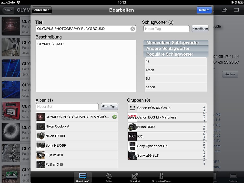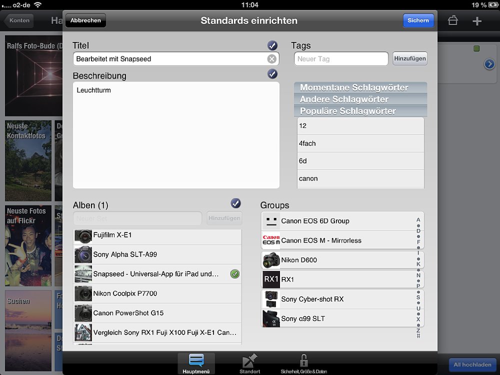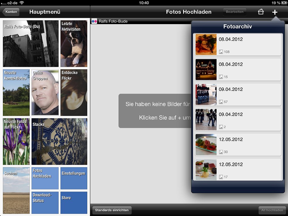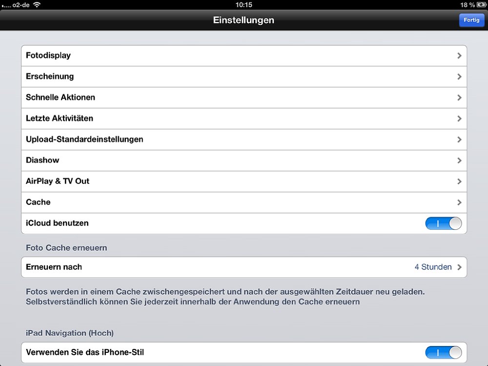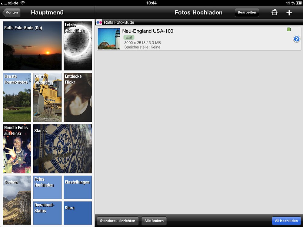 Möchtest du ein Bild in deinen Fotostream hochladen, tippe in der Startansicht auf das Feld „Fotos Hochladen“. Klicke im nächsten Feld auf die Plus-Taste oben rechts. Wähle nun aus, wo das Foto gespeichert ist – meist ist das das Fotoarchiv des iPads. Wähle das oder die Fotos aus und bestätige deine Auswahl. Mit einem Klick auf den kleinen blauen Pfeil rechts, kannst du das Foto sogar noch in einem einfachen Bildbearbeitungsprogramm verbessern, bevor du es hochlädst. Klicke nun auf „Standards einrichten“ und lege den Namen des Fotos, die Beschreibung, Tags und das Album fest, unter dem das Bild gespeichert werden soll. Nun einfach auf „Alle hochladen“ unten rechts klicken, schon werden alle gewählten Fotos hochgeladen. Zwei blaue Balken zeigen dir den Fortschritt des Hochladens an. Im Fotostream kannst du anschließend prüfen, ob das Hochladen geklappt hat. Hast du das Foto vorher noch nicht einem Album zugeordnet, kannst du dies nun nachholen mit einem Klick auf „Ändern“.