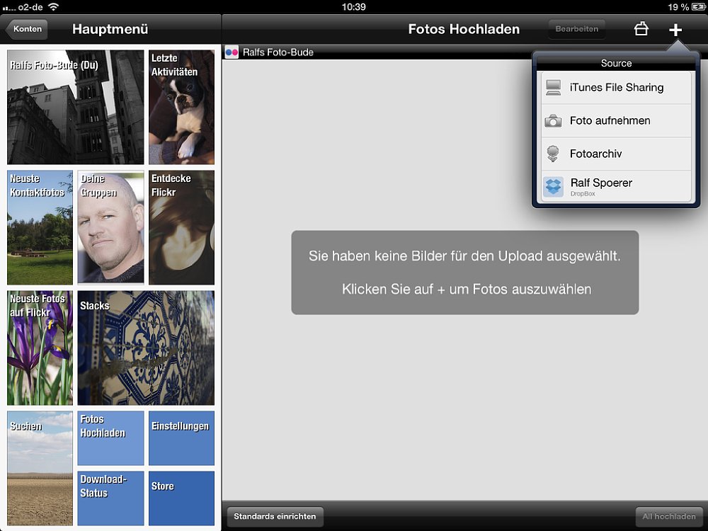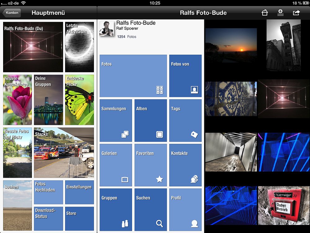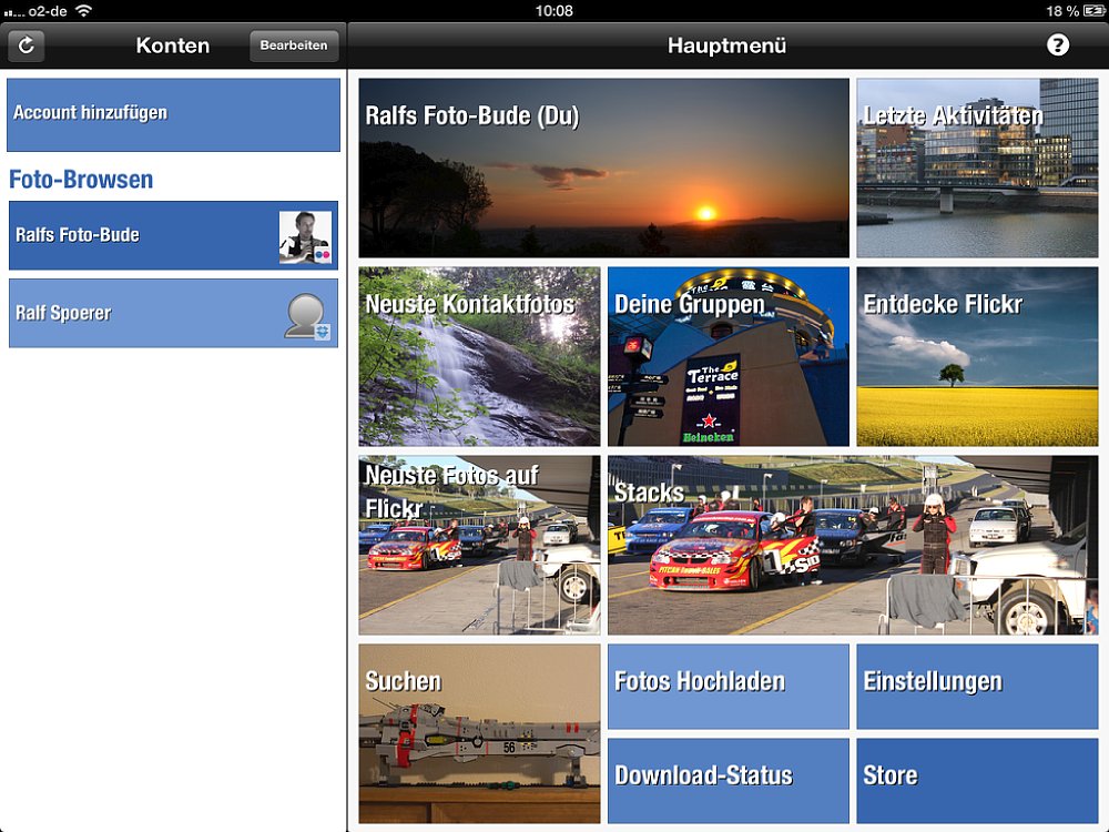 In der Startansicht werden unterschiedliche Bereiche von Flickr gezeigt. Unter anderem sind das die letzten Aktivitäten, neue Fotos, meine Gruppen und Stacks. Unter dem Punkt „Einstellungen“ kannst du die App ganz nach deinen Wünschen konfigurieren. Unter anderem kannst du festlegen, in welcher Größe Fotos angezeigt werden sollen und in welcher Größe du Fotos in deinen Fotostream hochladen willst. Außerdem kannst du das Aussehen der App anpassen.