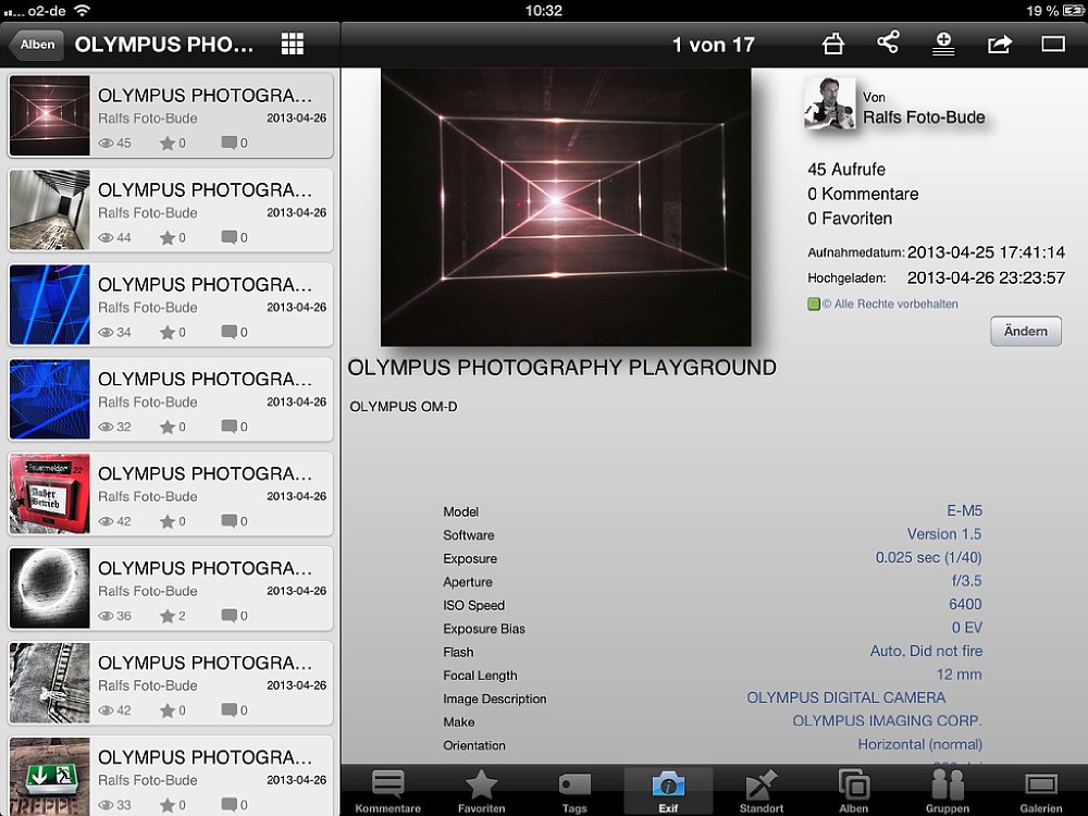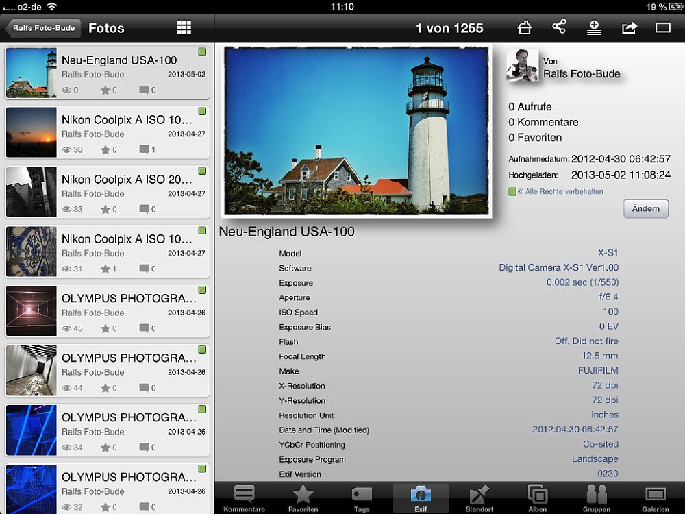 Tippe im Hauptmenü auf die Kachel mit dem Namen deines Flickr-Kontos. Nun kannst du in deinen Alben, Sammlungen und Fotos stöbern. Tippe auf Alben, und du bekommst eine Übersicht all deiner angelegten Alben. Klicke eines der Alben an, und du siehst die Fotos, die darin abgelegt sind. Mit einem Klick auf das obere rechte Symbol kannst du zwischen Listen- und Kachel-Ansicht wechseln. Tippe eines der Bilder an, und du siehst eine Detailansicht mit allen wichtigen Informationen. Klicke das Feld „Exif“ in der unteren Leiste an, und es werden die EXIF-Daten des Fotos angezeigt. Möchtest du Änderungen am Namen, den Tags oder der Beschreibung des Fotos vornehmen, klicke auf Bearbeiten. Tippe einmal auf das Foto und es wird etwas größer angezeigt, mit einem weiteren Tipp wird es in der Vollansicht gezeigt.