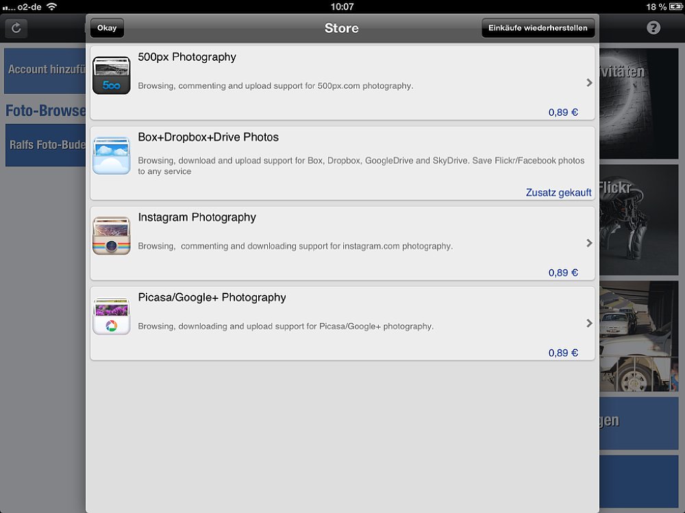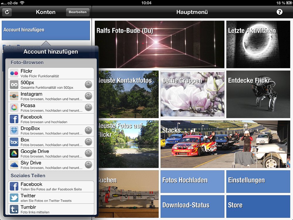 Nachdem du die App heruntergeladen hast, stellst du zunächst die Verbindung zu deinem Flickr-Account her. Hast du mehrere Konten – kein Problem, einfach einen weiteren Account hinzufügen. Zusätzlich bietet die App die Möglichkeit, andere Communities einzubinden. Dazu werden allerdings In-App-Käufe für 0,89 Euro erforderlich. Zur Auswahl stehen unter anderem 500px, Instagram, Picasa, DropBox und Google Drive. Hast du beispielsweise eine Verbindung zu deinem Dropbox-Konto, kannst du dir die dort gespeicherten Bilder ebenfalls in der FlickStackr-App anschauen.