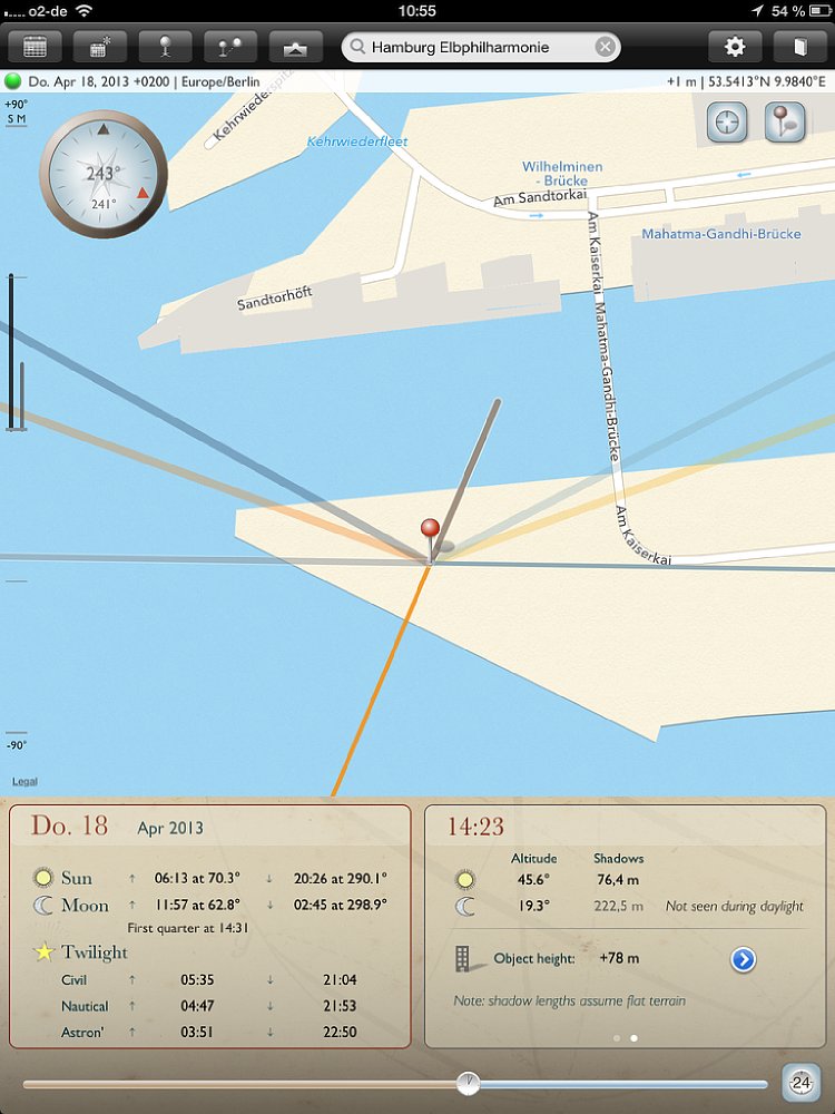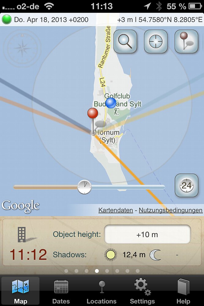 Das rechte untere Feld kann mit einem Fingerzeig weiter geblättert werden. Unter dem Punkt „Object height“ kann die Höhe eines Objekts eingegeben werden. Auf der Karte wird dann je nach Sonnenstand die Länge des Schattens angezeigt. So kannst du beispielsweise feststellen, ob benachbarte Gebäude mit ihrem Schatten das Hauptmotiv verdecken. Die Länge des Schattens wird zusätzlich im Feld in Meter angegeben.