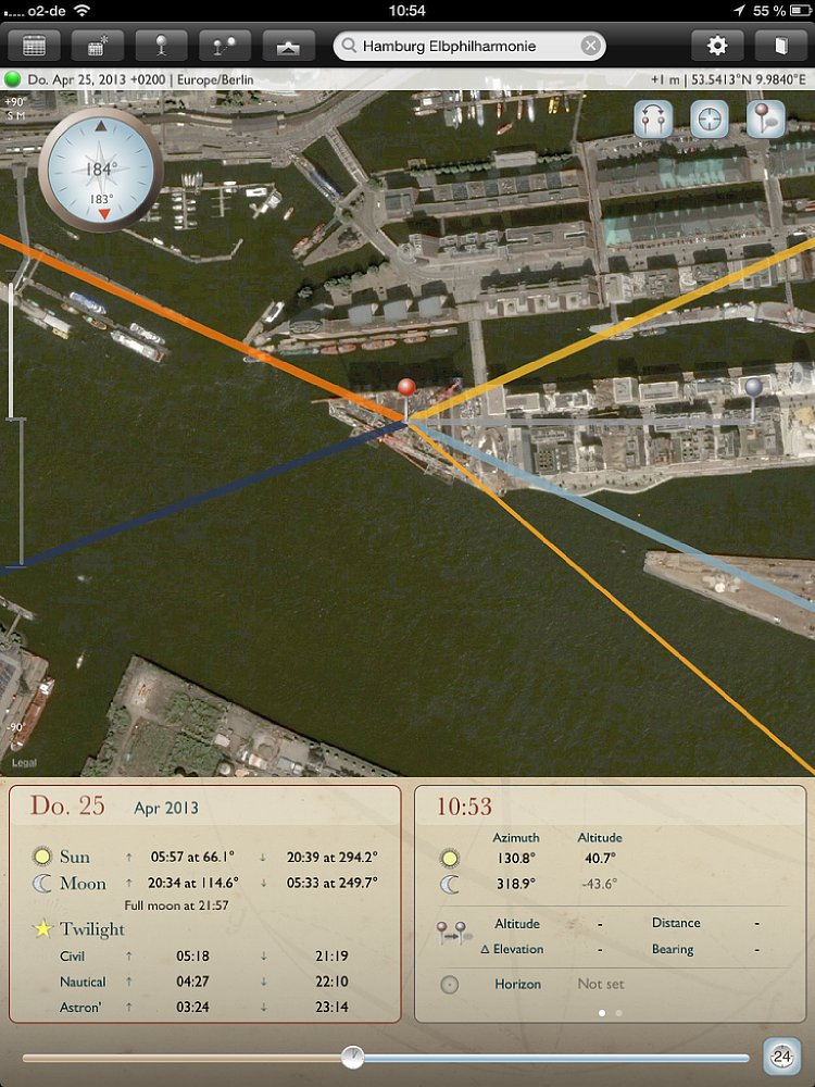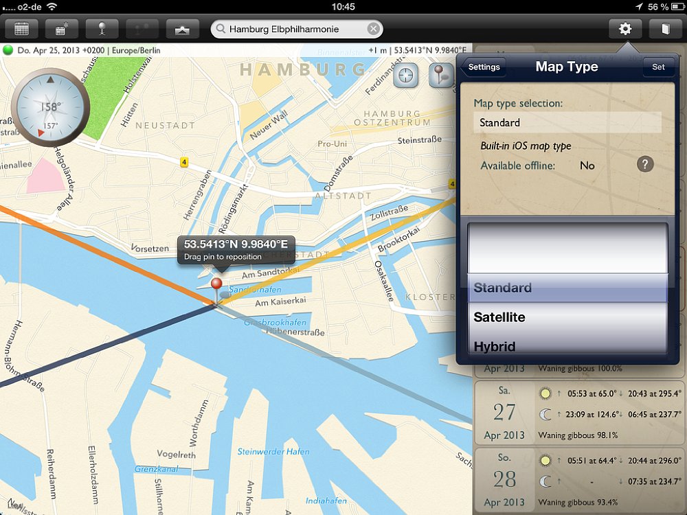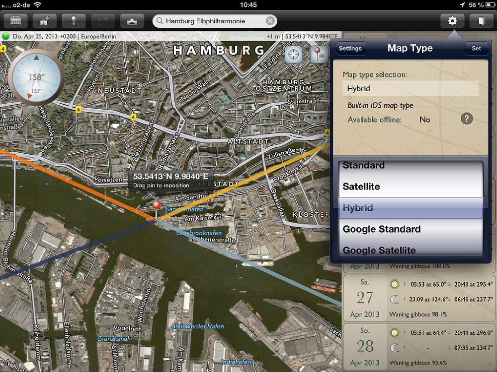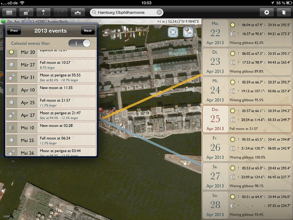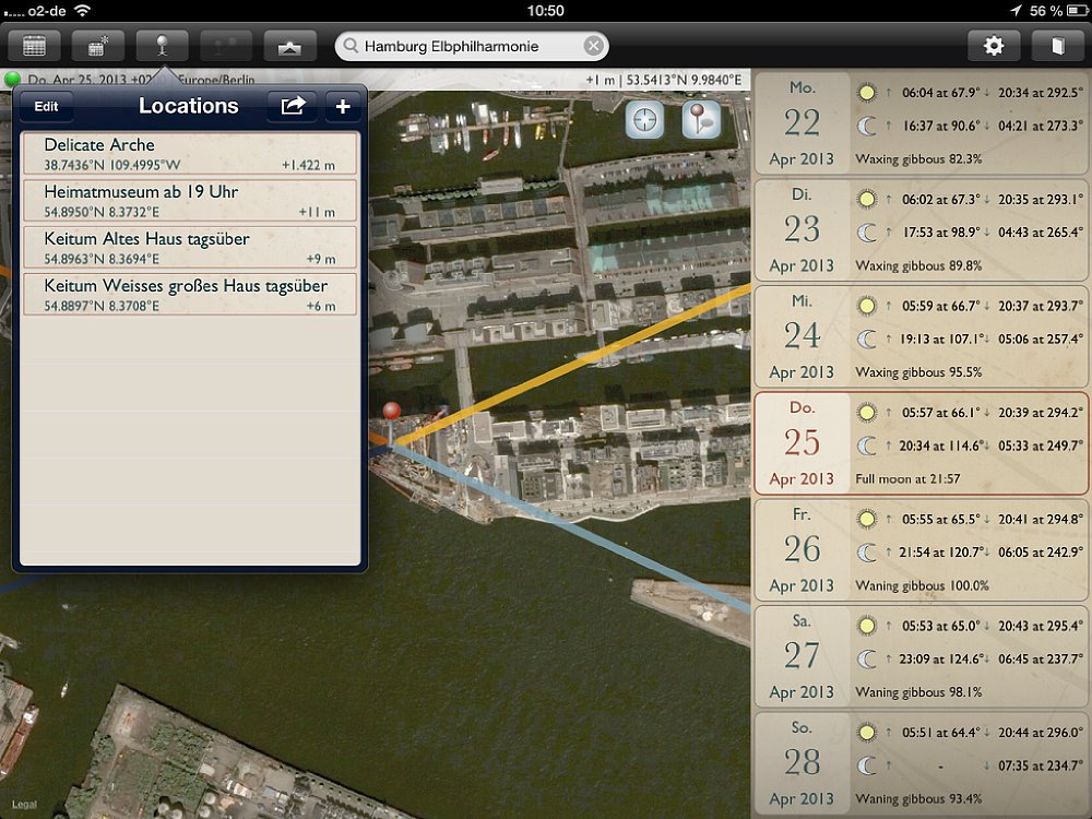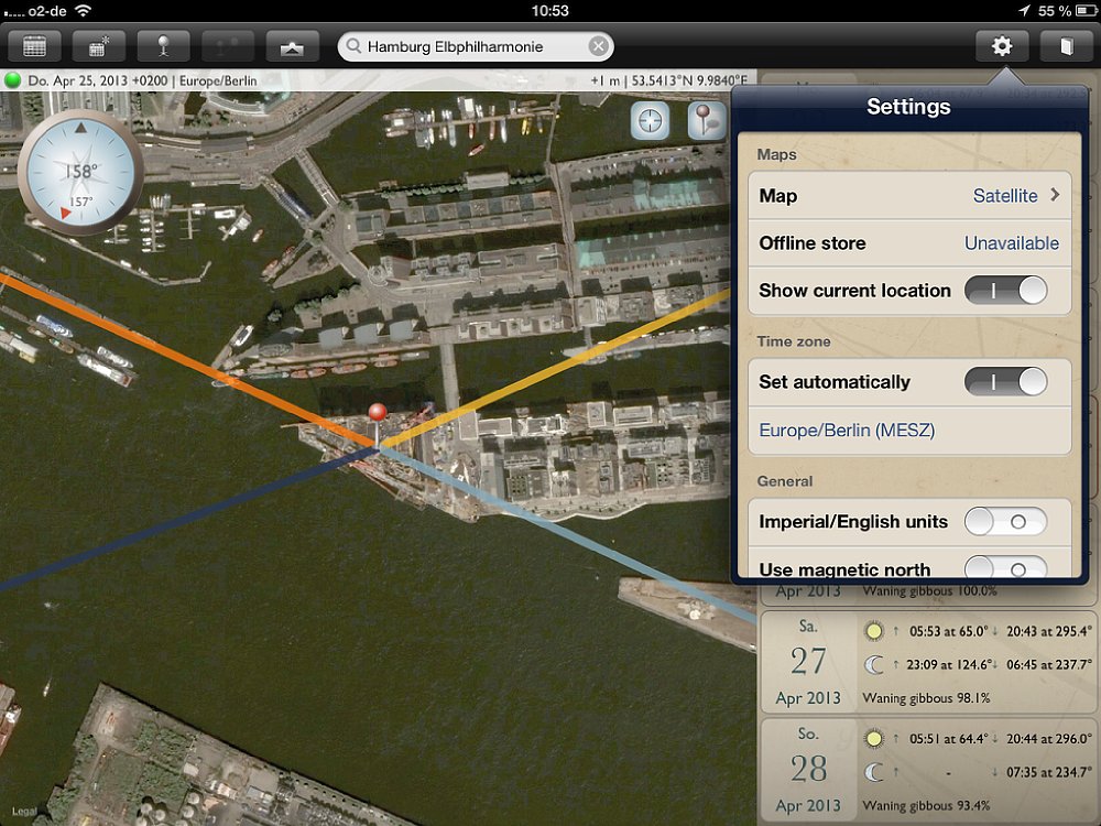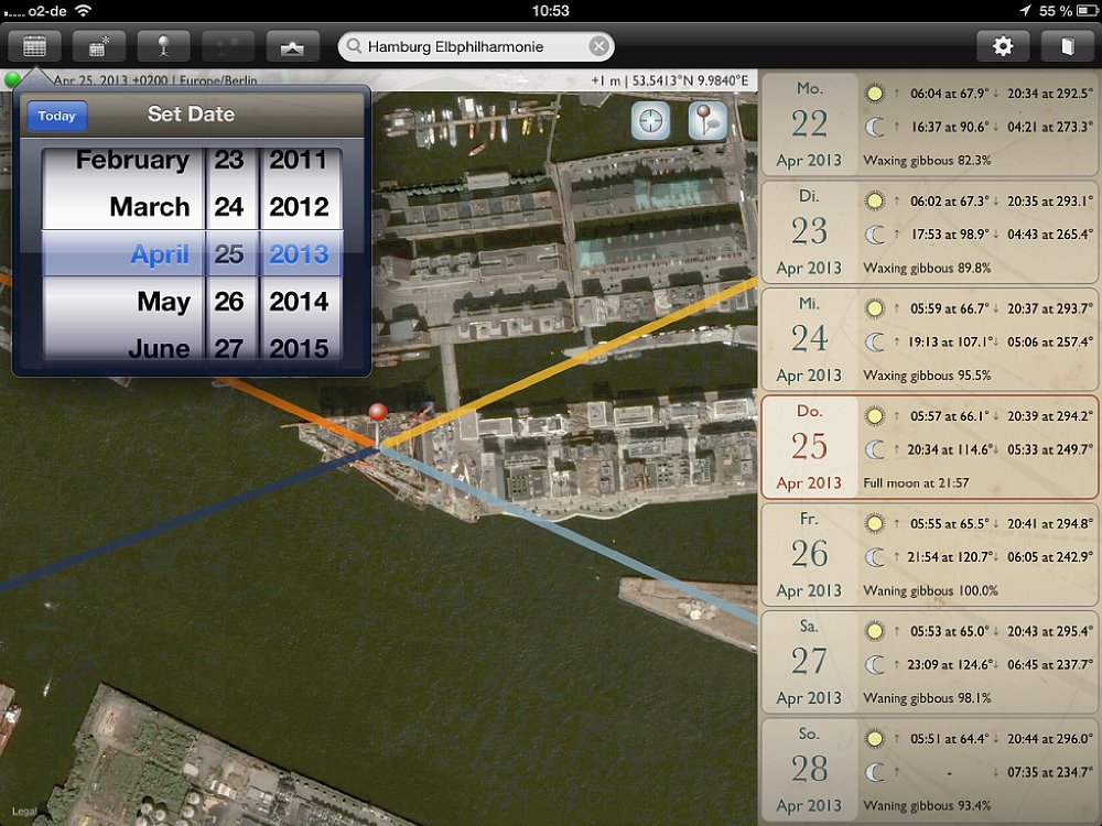 Obwohl die App sowohl für Smartphones und Tablets ist, empfiehlt es sich, für die Routenplanung ein Tablet zu verwenden, da die Kartenansichten deutlich größer sind. Für die schnelle Suche unterwegs bietet das Smartphone genau die gleichen Funktionen, wie auf dem Tablet – nur in kleinerer Ansicht. Wichtig: Auf dem Tablet gibt es einen Unterschied zwischen der Quer- und Hochformat-Ansicht – auf dem Smartphone nicht. Wird die App in der Queransicht gestartet, so nimmt die Kartenansicht den größten Teil des Bildschirms ein. Auf der rechten Seite wird eine Datumsleiste mit sieben Tagen eingeblendet, wobei das aktuelle Datum in der Mitte ist. Zu den jeweiligen Tagen werden die Zeiten für Sonnenauf- und -untergang, sowie Mondauf- und -untergang angezeigt; außerdem der „Füllstand“ des Mondes in Prozent. Mit einem Klick auf das Fadenkreuz oben rechts auf der Karte wird sie an den aktuellen Standort verschoben. Vier Linien zeigen an, wo der Sonne und Mond aufgehen (gelbe und hellblaue Linie) und Sonne und Mond untergehen (orange und dunkelblaue Linie).