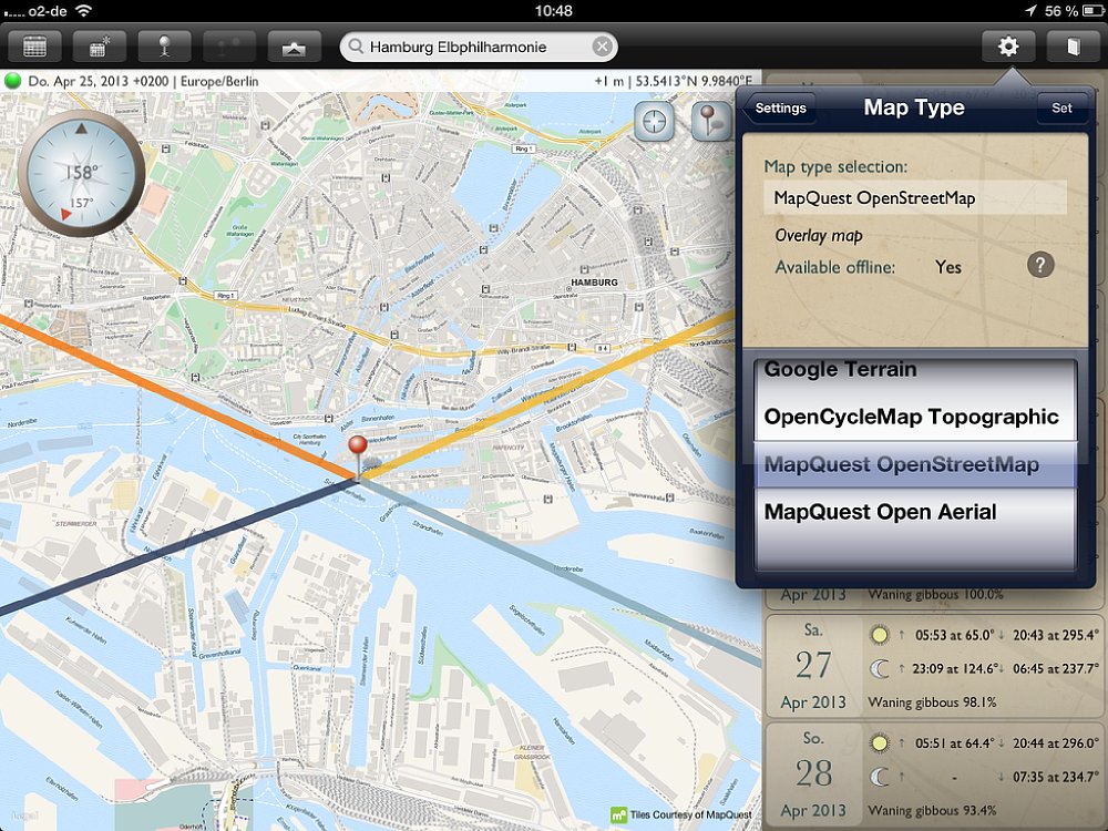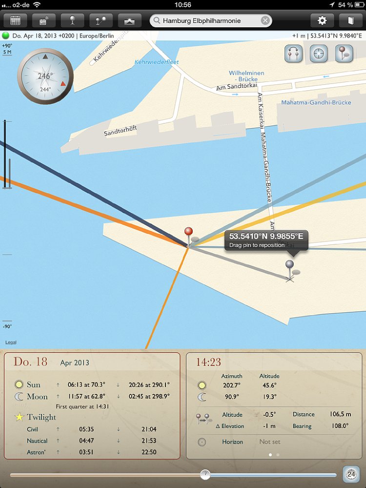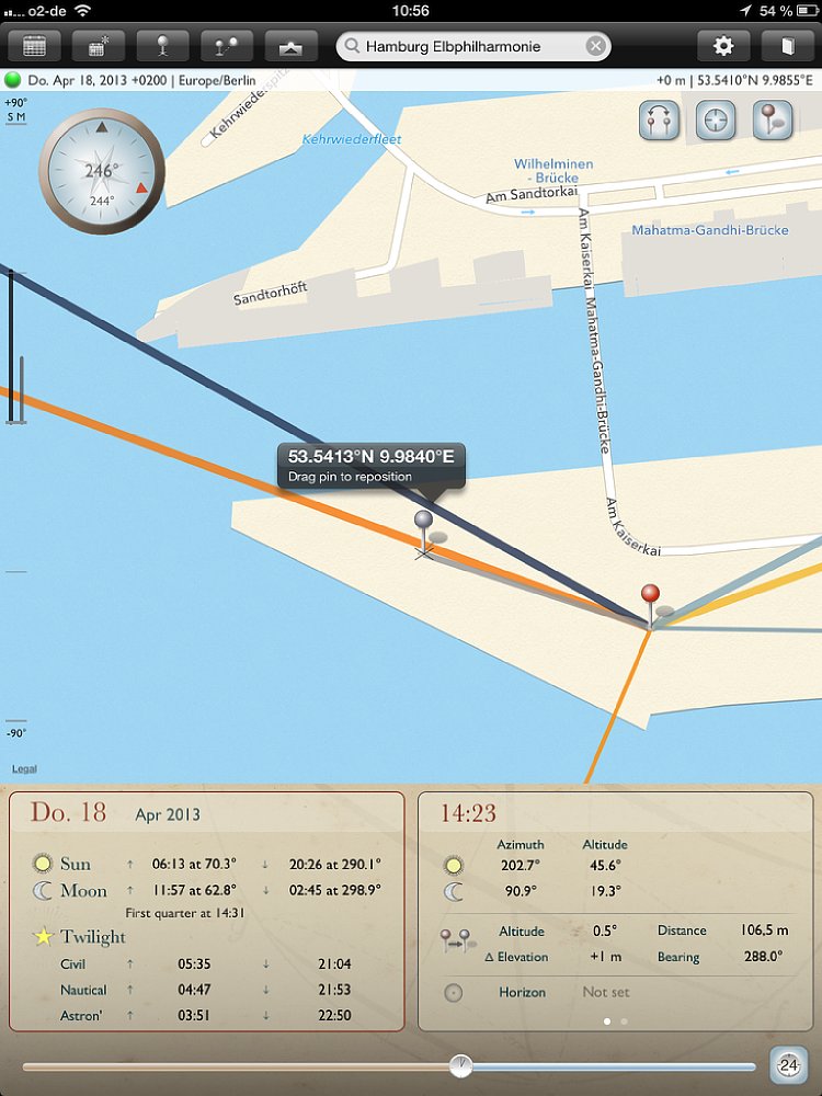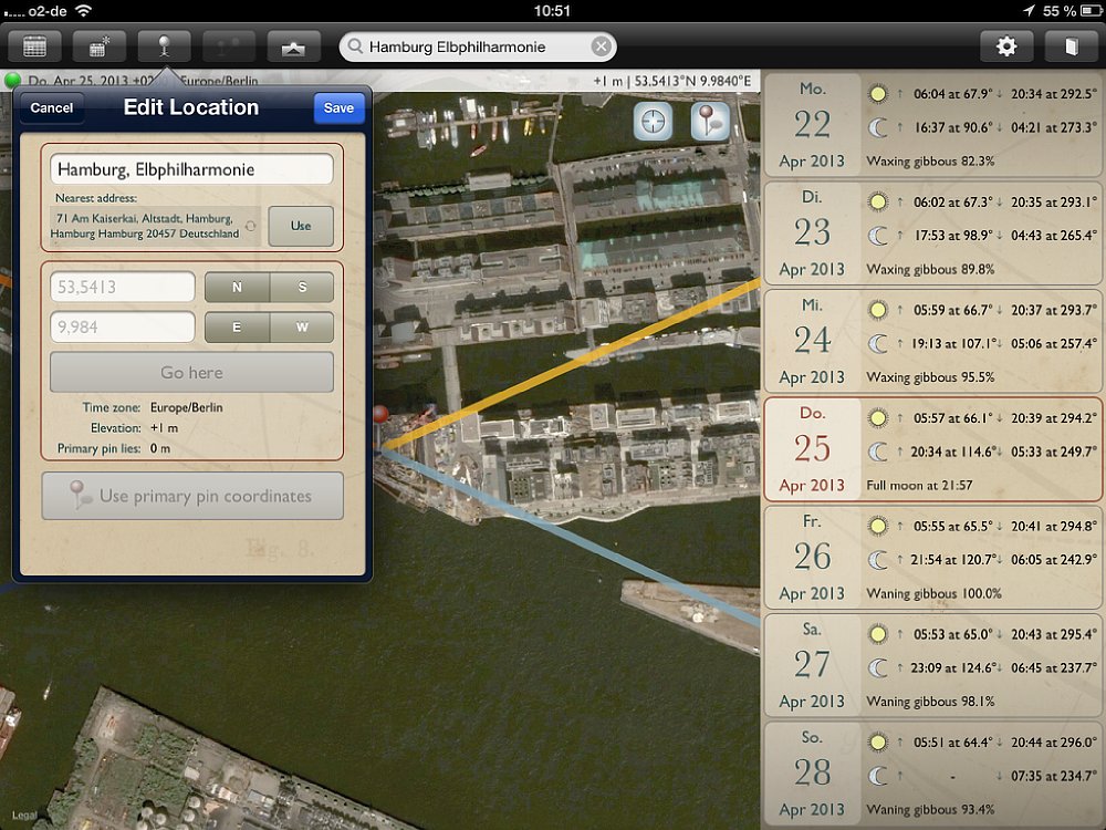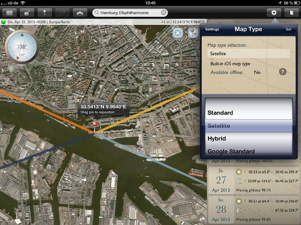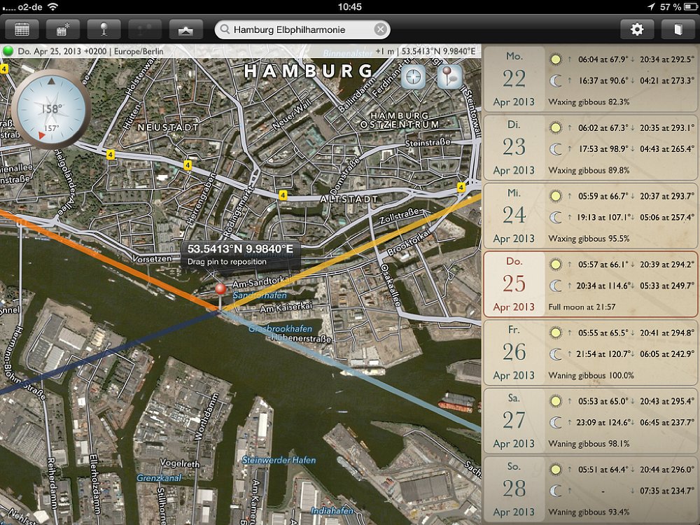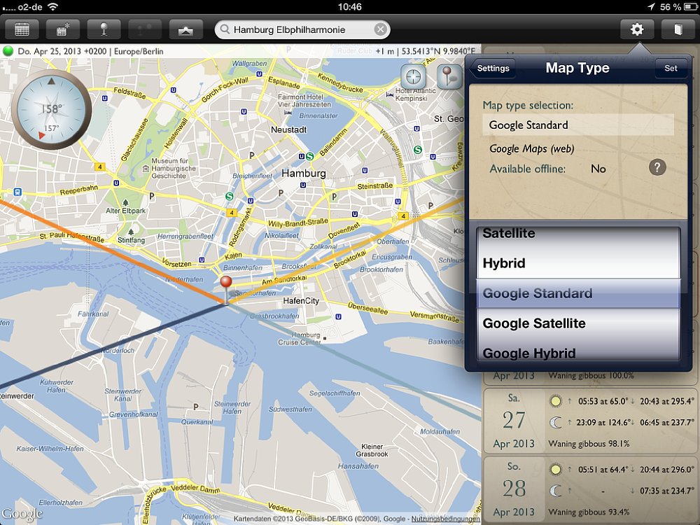Obwohl die App sowohl für Smartphones und Tablets ist, empfiehlt es sich, für die Routenplanung ein Tablet zu verwenden, da die Kartenansichten deutlich größer sind. Für die schnelle Suche unterwegs bietet das Smartphone genau die gleichen Funktionen, wie auf dem Tablet – nur in kleinerer Ansicht. Wichtig: Auf dem Tablet gibt es einen Unterschied zwischen der Quer- und Hochformat-Ansicht – auf dem Smartphone nicht. Wird die App in der Queransicht gestartet, so nimmt die Kartenansicht den größten Teil des Bildschirms ein. Auf der rechten Seite wird eine Datumsleiste mit sieben Tagen eingeblendet, wobei das aktuelle Datum in der Mitte ist. Zu den jeweiligen Tagen werden die Zeiten für Sonnenauf- und -untergang, sowie Mondauf- und -untergang angezeigt; außerdem der „Füllstand“ des Mondes in Prozent. Mit einem Klick auf das Fadenkreuz oben rechts auf der Karte wird sie an den aktuellen Standort verschoben. Vier Linien zeigen an, wo der Sonne und Mond aufgehen (gelbe und hellblaue Linie) und Sonne und Mond untergehen (orange und dunkelblaue Linie).