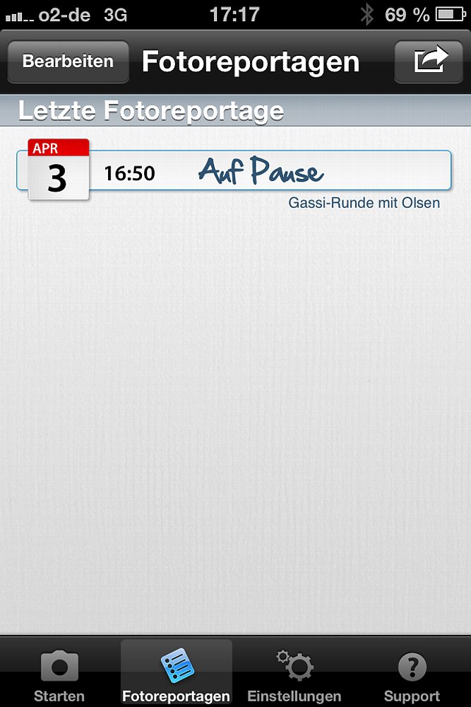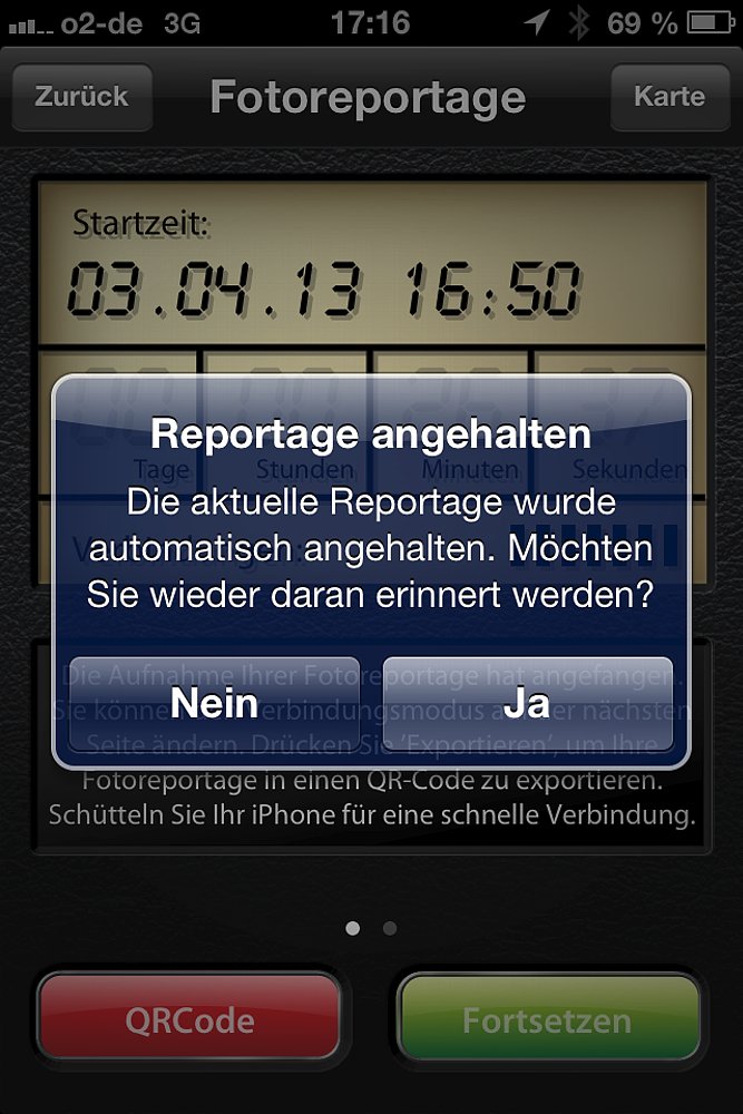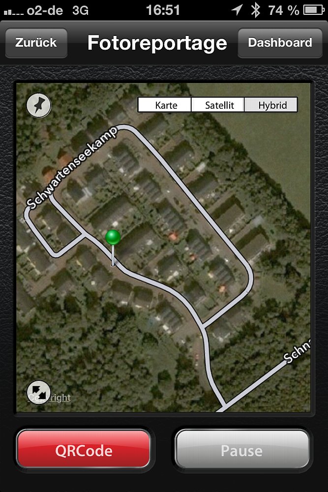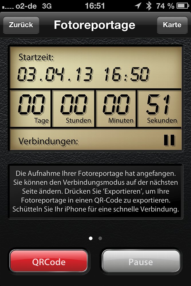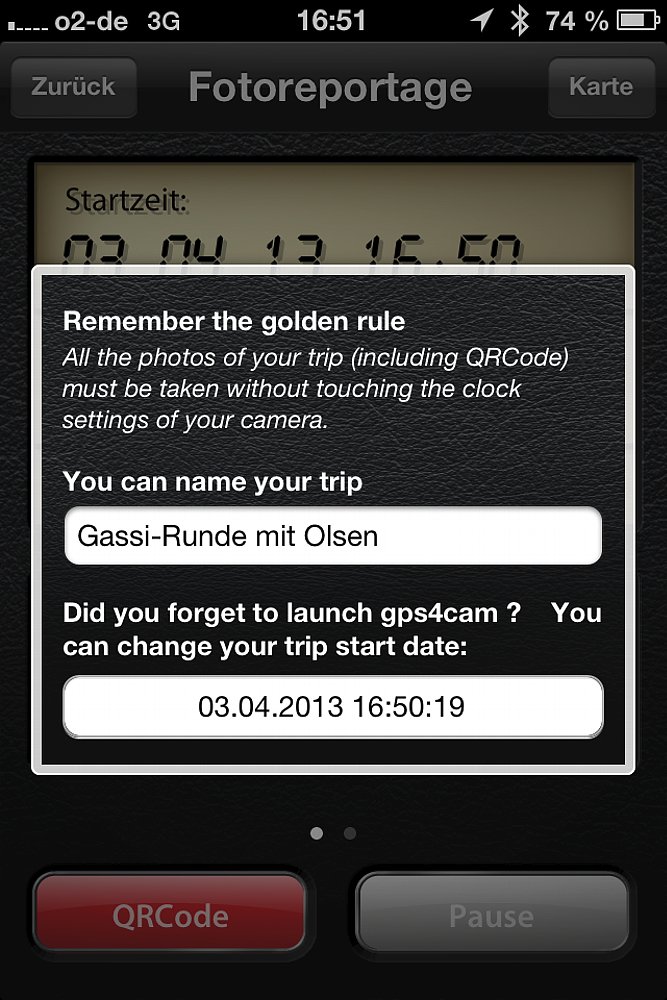 Ist die Fotoreportage gestartet, kannst du nun den Namen für die Fotoreportage eingeben. Es erscheint ein Bildschirm auf dem die Startzeit, die Laufzeit und die GPS-Verbindungen angezeigt werden. Mit einem Fingerwisch nach links auf dem Display wird eine Karte mit dem aktuellen Standort angezeigt. Nun kann es mit der Fotosafari losgehen. Wichtig: Das Smartphone sollte nicht in einer Tasche in der untersten Ecke unter allem möglichen Fotozubehör vergraben werden. Sonst besteht die Gefahr, dass keine GPS-Daten empfangen werden können. Am besten trägst du das Handy in der Hemd- oder äußeren Jackentasche.