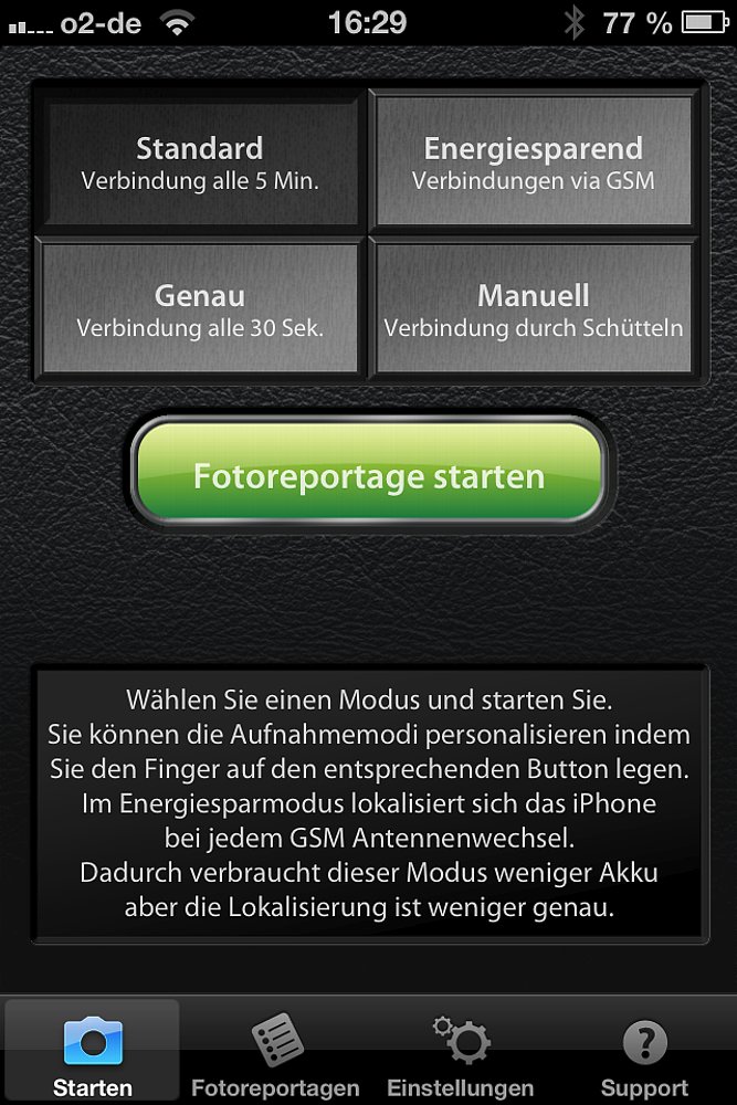 Nachdem die App gestartet wurde, kann es auch schon losgehen. Zu Beginn der Fototour wählst du, in welchem Intervall die Ortsdaten ermittelt werden sollen. In der Standard-Einstellung wird der Standort im Abstand von einer Minute, fünf oder zehn Minuten gespeichert. In den Einstellungen des Programms kann der Wert festgelegt werden. Dabei gilt: Je häufiger die Speicherung, desto mehr Strom wird verbraucht und umso kürzer ist die Akkulaufzeit des Smartphones. In der Einstellung „Genau“ wird der Standort alle 30 Sekunden gespeichert. In der Pro-Variante können beide Modi zwischen 10 Sekunden und 30 Minuten eingestellt werden. Daneben gibt es die Option „Energiesparend“, in der der Standort immer dann neu ermittelt wird, wenn sich das Handy von einer GSM-Zelle in die nächste bewegt und ein Wechsel des Sendemastes stattfindet. Diese Methode ist natürlich weniger genau und eignet sich in Städten nicht gut, da dort wesentlich seltener Antennenwechsel stattfinden. Besonders energiesparend ist die Einstellung „Manuell“. Bei der musst du die Standortbestimmung manuell durch Schütteln des Smartphones aktivieren. Aber Achtung: Vergisst du das Handy zu schütteln, werden keine Daten aufgezeichnet!