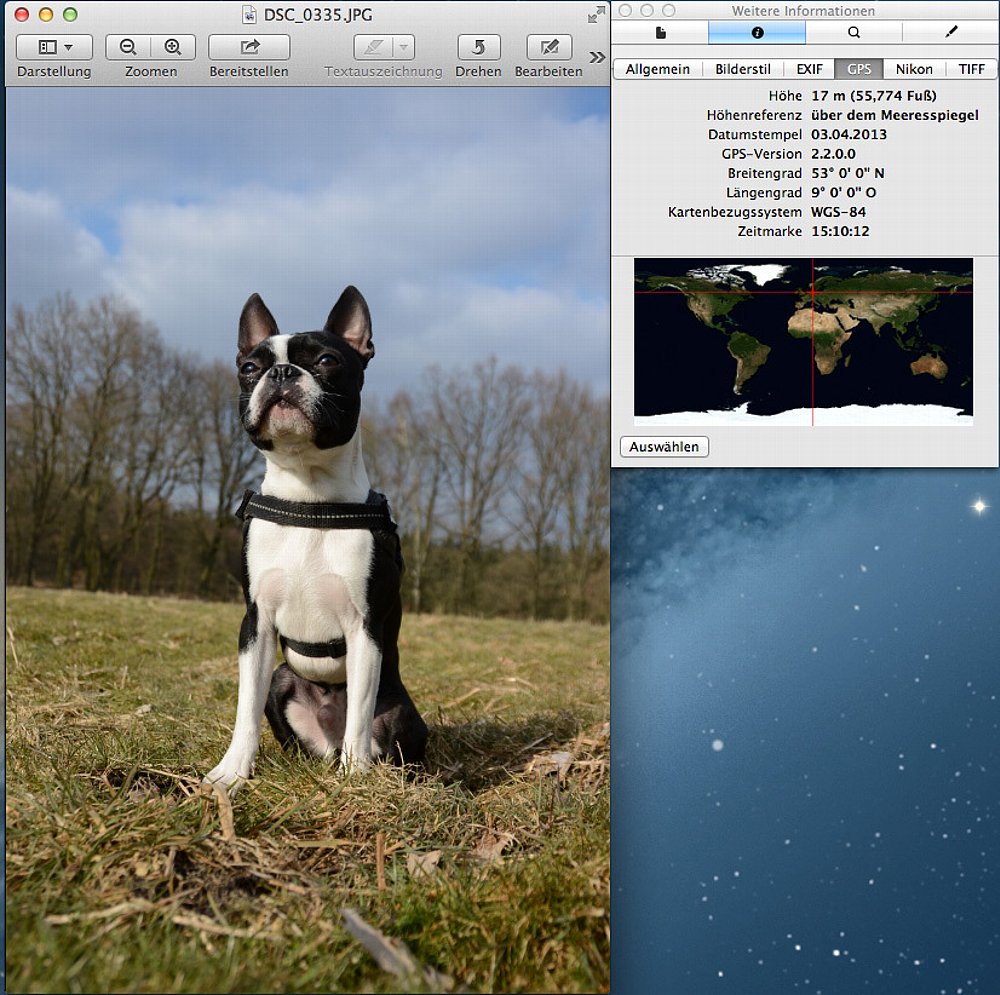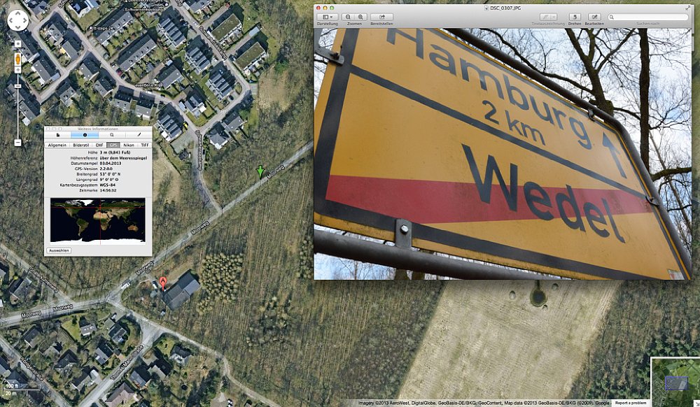 Nun einfach die geschossenen Aufnahmen auf den Computer kopieren und auf der gps-4cam-Hompage die kostenlose PC- oder Mac-Software herunterladen und installieren. Anschließend das Programm aufrufen, den Ordner wählen, in dem sich die Originalbilder befinden und einen Zielordner angeben. Nach wenigen Sekunden sind die Aufnahmen mit Geodaten verknüpft. Ein Blick in die erweiterten EXIF-Daten zeigt das Ergebnis. Mit einem Klick lässt sich der Aufnahme-Standort in entsprechenden Anwendungen – wie etwa Google-Maps – anzeigen. Einfacher und schneller geht es kaum. Noch ein Tipp: Lege vor der Fotosafari in den Systemeinstellungen der Kamera einen neuen Ordner an, in dem die Bilder gespeichert werden sollen. So lassen sich die Aufnahmen nach der Tour noch einfacher in einen eigenen Ordner kopieren. Lässt sich bei deiner Kamera kein neuer Ordner anlegen, kannst du alternativ auch eine neue Speicherkarte einlegen.