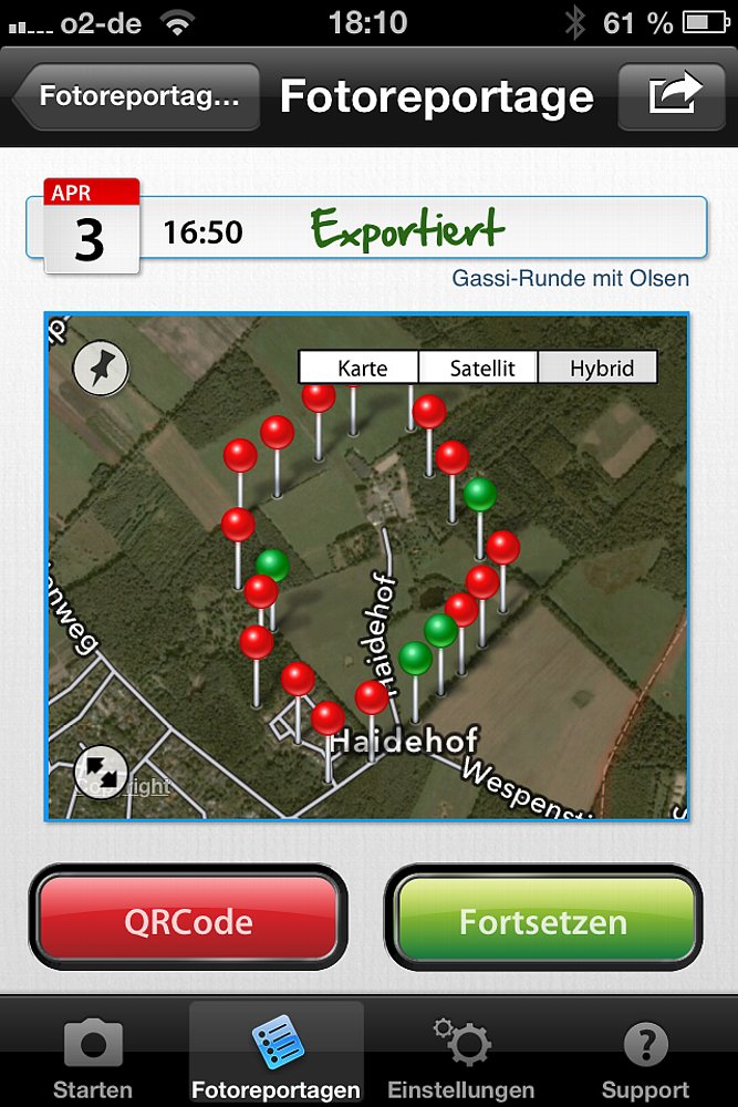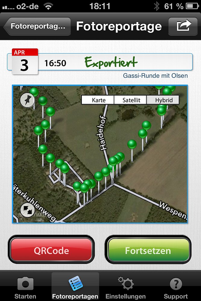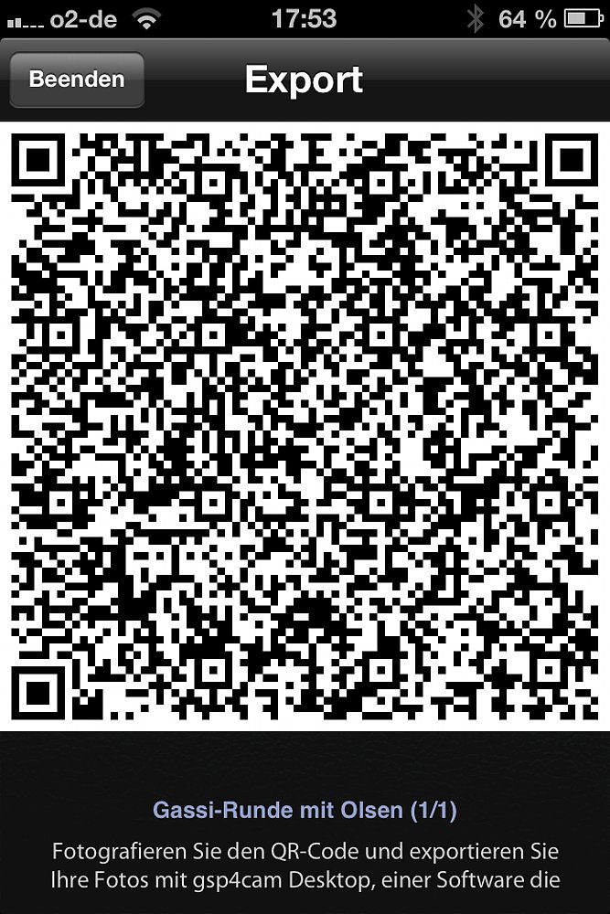 Bist du am Ziel angekommen, wird die Aufzeichnung gestoppt. Nun wird mit einem Druck auf „Exportieren“ (in der Pro-Variante „QRCode“) ein QR-Code erzeugt. Der wird nun einfach mit der Kamera oder den Kameras abfotografiert. Wichtig: Es bringt nichts, einen Screenshot auf dem Handy zu machen, da so die eingestellte Uhrzeit auf den Kameras nicht mitgespeichert wird. Und die ist erforderlich, um später die Fotos mit den passenden Geodaten zu versehen. Es ist übrigens nicht nötig, die Uhrzeit von Smartphone und Kamera zu synchronisieren. Das geschieht über die Aufnahme des QR-Codes. Der verändert sich übrigens kontinuierlich auf dem Anzeigefeld des Smartphones, so dass du dir ruhig Zeit lassen kannst mit der Aufnahme oder den Aufnahmen. Der QR-Code kann auch noch Stunden nach Ende der Foto-Tour abfotografiert werden. Nur die Uhrzeit in der Kamera darf in der Zwischenzeit nicht verstellt werden.