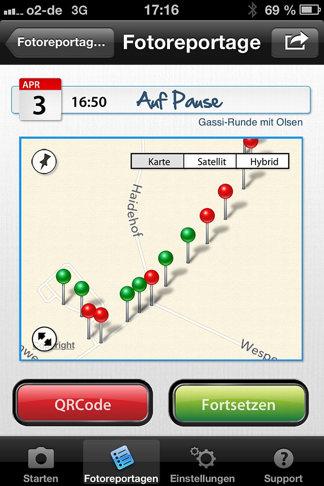 Gehst du während der Fotosafari längere Zeit in geschlossene Gebäude, wie etwa Museen, solltest du die Pausen-Taste drücken. So wird Energie gespart und die Laufzeit des Handys verkürzt sich nicht unnötig. Während der Tour kannst du dir die zurückgelegte Route auf dem Handy anzeigen lassen.