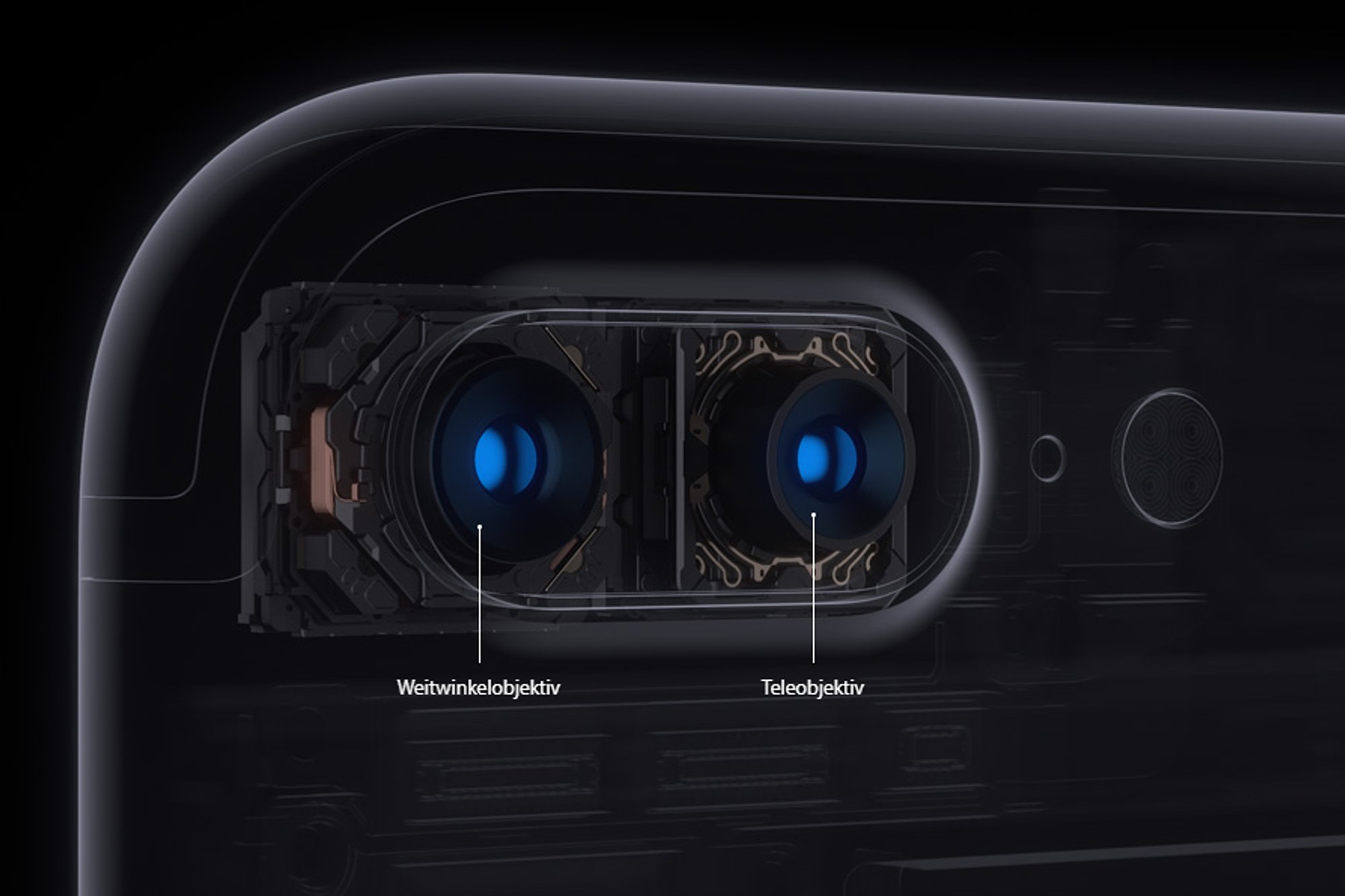 • Bild Die Doppelkamera des Apple iPhone 7 Plus hat je ein Kameramodul mit Weitwinkel (28 mm kleinbildequivalente Brennweite) und "Teleobjektiv" (56 mm Brennweite, eigentlich eher eine sogenannte "Normalbrennweite"). [Foto: Apple]