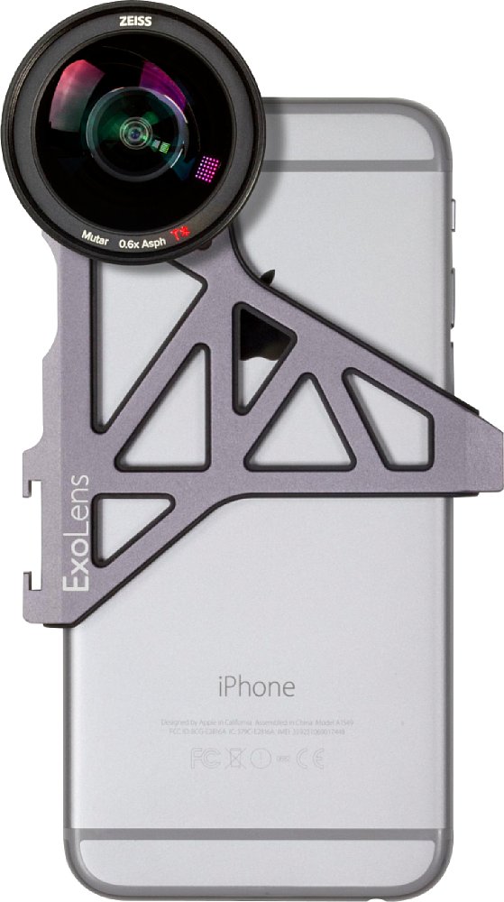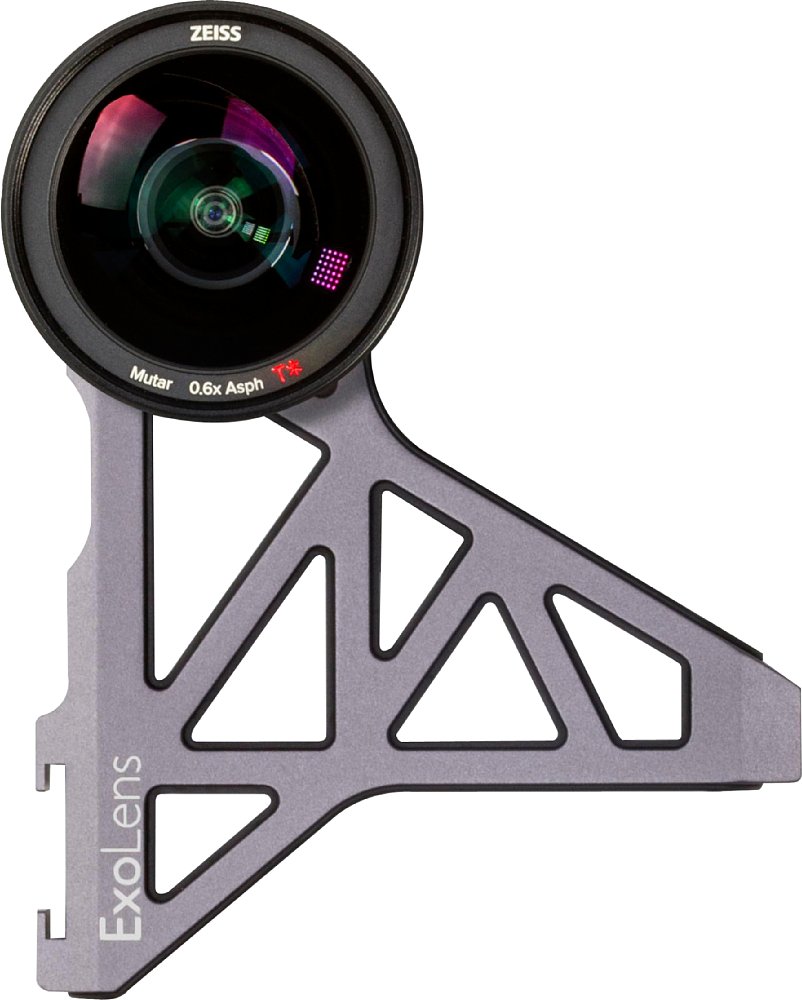 Beim ersten Vorsatzobjektiv aus dieser Serie, das sich Zeiss Mutar 0,6x Asph T* nennt, handelt es sich um einen Weitwinkelkonverter. Ausgestattet mit der von Zeiss patentierten T*-Glasvergütung werden Innenreflektionen reduziert und so bei schwierigen Lichtverhältnissen optimale Kontraste gewährleistet. Der Zeiss Mutar Weitwinkelkonverter ist mit einer asphärisch geschliffenen Linse ausgestattet. Diese Art von Linsen ist für verbesserte Schärfenleistung in den Randbereichen und zur Reduzierung von Farbquerfehlern zuständig. Der eigentliche Objektivhalter ExoLens ist aus Aluminium gefertigt. Um das Smartphone nicht zu verkratzen, ist zusätzlich eine weiche Kunststoffeinlage in den Halter eingearbeitet. Der Aluminiumhalter besitzt darüber hinaus noch ein ¼“ Gewinde, damit du die Konstruktion auf einem Stativ befestigen kannst. Auch einen Zubehörhalter für Mikrofone oder Lampen kannst du daran montieren.