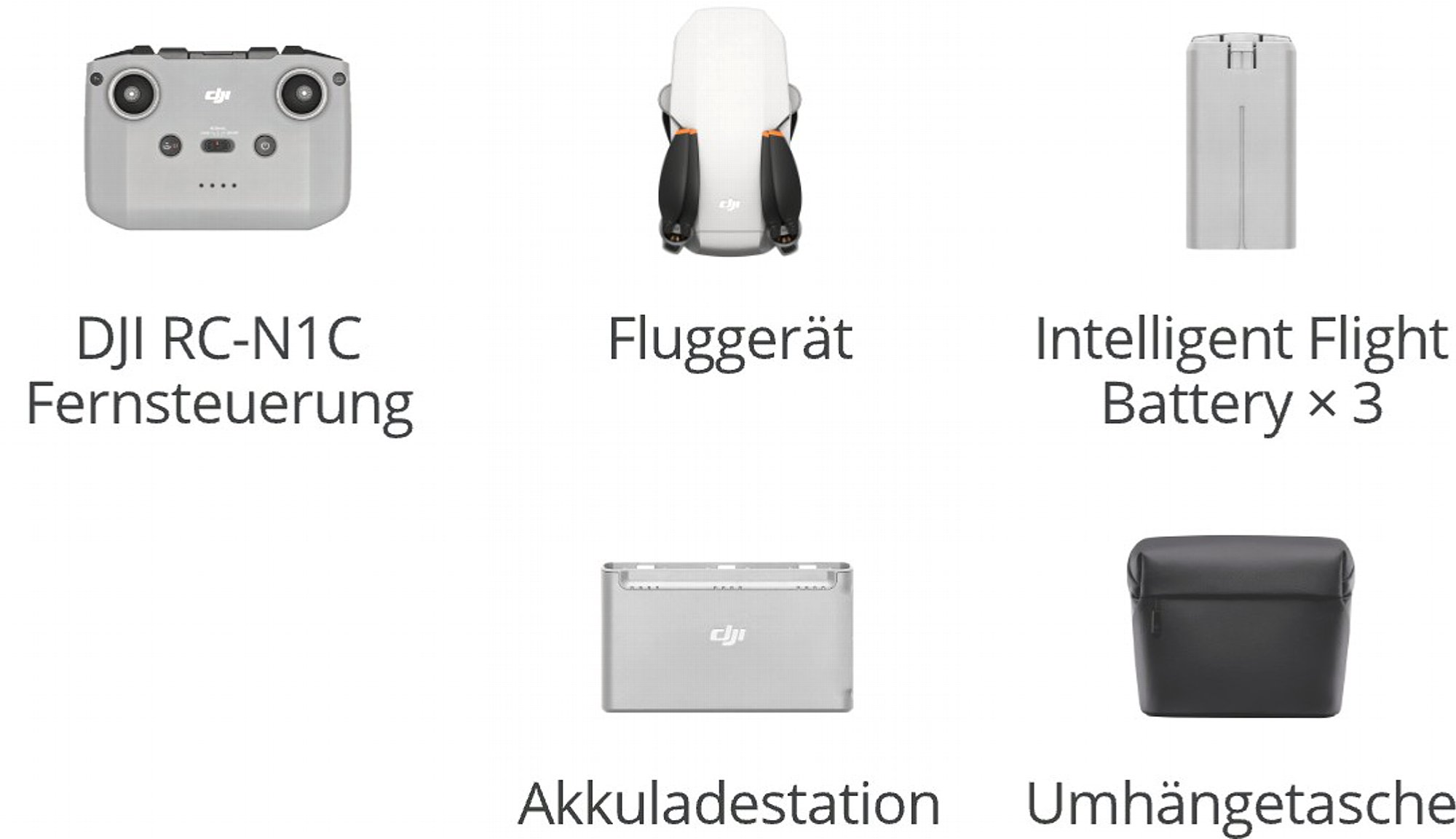 Apropos Fly More Combo: Der sehr günstige Einstiegspreis der DJI Mini 4K von 299 Euro gilt für die Basisausstattung, bestehend aus der Drohne selbst, 1 Paar Ersatzpropeller (links, rechts), 1 Akku und Fernsteuerung RC-N1C nebst Smartphone-Anschlusskabel und USB-C-Daten- und Ladekabel. Mit dem erweiterten Kit namens DJI Mini 4K Fly More Combo für 439 Euro sind zusätzlich dabei: weitere Ersatzpropeller, zwei weitere Akkus, eine Ladeschale für die drei Akkus (mit denen sich die Akkus auch als Powerbank verwenden lassen) sowie eine Umhängetasche. Dazu braucht man noch in jedem Fall eine Micro-SD-Speicherkarte (ca. 20 Euro). Wer auf die Tasche und die Ladeschale keinen Wert legt, bekommt die Akkus auch einzeln für gut 50 Euro. Mindestens einen weiteren Akku würden wir aber auf jeden Fall empfehlen, sonst ist der Flugspaß schnell zu Ende. In der Regel ergeben tatsächlich auch drei Akkus Sinn, sodass die meisten Leute ohnehin zur Fly More Combo greifen dürften.