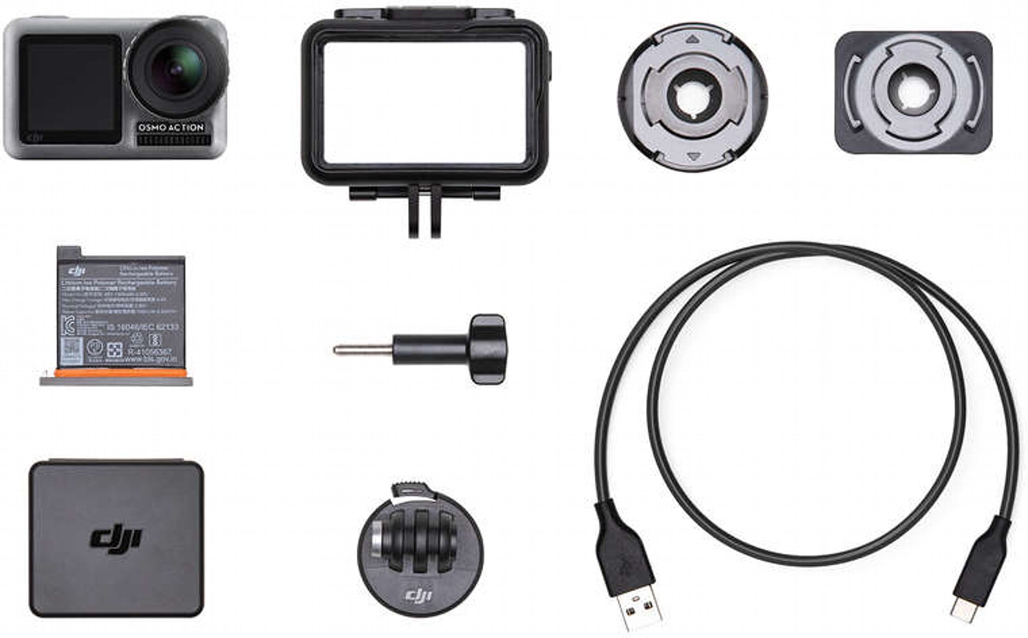 Dank wasserdichter Versiegelung und einer wasserabweisenden Beschichtung auf dem Touchscreen, ist die Osmo Action bis zu einer Tiefe von 11 Metern wasserdicht. Die Objektivabdeckung ist austauschbar und kann auf Wunsch durch einen Neutraldichtefilter ersetzt werden. Kamera inklusive Akkus sind bei Temperaturen von bis zu -10 ℃ einsatzfähig. Geladen wird der Akku über USB-C. Über den USB-C-Port kann mittels optionalem Adapter auch ein externes Mikrofon angeschlossen werden. Eingebaut sind zwei Mikrofone (oben und seitlich). Als App im Smartphone kommt die DJI Mimo App zum Einsatz, genau wie bei der DJI Osmo Pocket Gimbal-Kamera. Von GPS oder Positionsdatenabgleich mit der App ist übrigens keine Rede. Ebenso wenig von "Sensoren" (Höhe, Druck, Beschleunigung), womit einige der Mitbewerber werben. Ein Stativgewinde ist nicht direkt eingebaut, sondern man muss eine Rahmenhalterung verwenden, um die Kamera an Stativen, Selfie-Sticks oder diversen Halterungen anzubringen. Die Rahmenhalterung ist laut DJI mit "herkömmlichem Zubehör für Action-Kameras" kompatibel, d. h. diese folgt dem von GoPro definierten Quasi-Standard.
