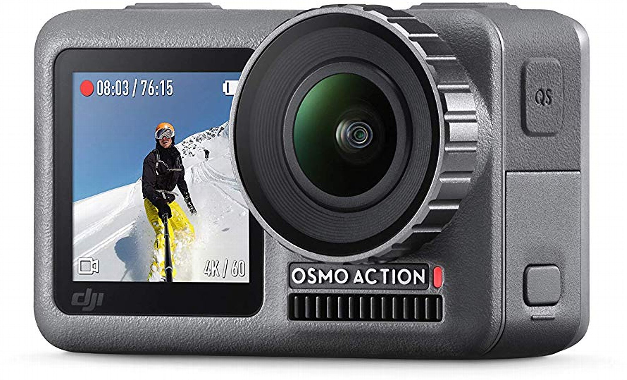 Die Bedienung erfolgt im Wesentlichen über den 2,25-Zoll-Touchscreen auf der Rückseite der DJI Osmo Action. Daneben gibt es nur noch drei Tasten. Oben sitzen Ein/Aus-Schalter und die Aufnahme-Start/Stop-Taste (im Foto-Modus der Auslöser). Seitlich sitzt die sogenannte QS-Taste (für "QuickSwitch"), die einen schnellen Wechsel zwischen häufig verwendeten Modi ermöglicht und mit der man durch langes Drücken zwischen beiden Monitoren umschalten kann. Auch eine Sprachsteuerung bietet die DJI Osmo Action, GoPro lässt grüßen. Mit fünf Sprachbefehlen können so die wichtigsten Funktionen freihändig bedient werden, was bei Actioncams, die man typischerweise eher nicht direkt in der Hand hält, natürlich auch Sinn macht.