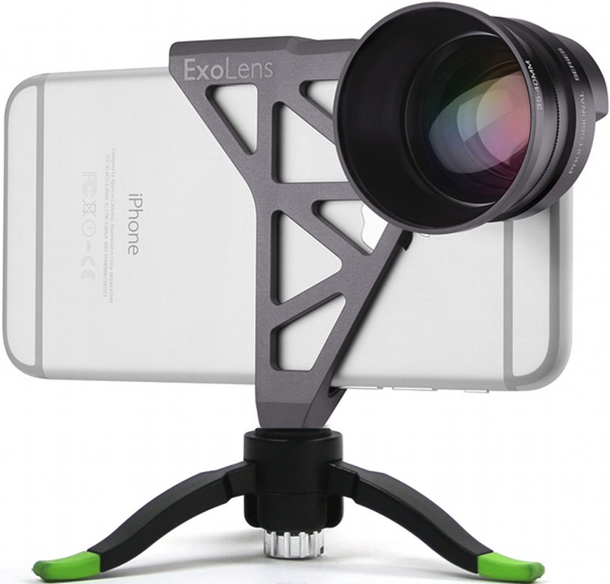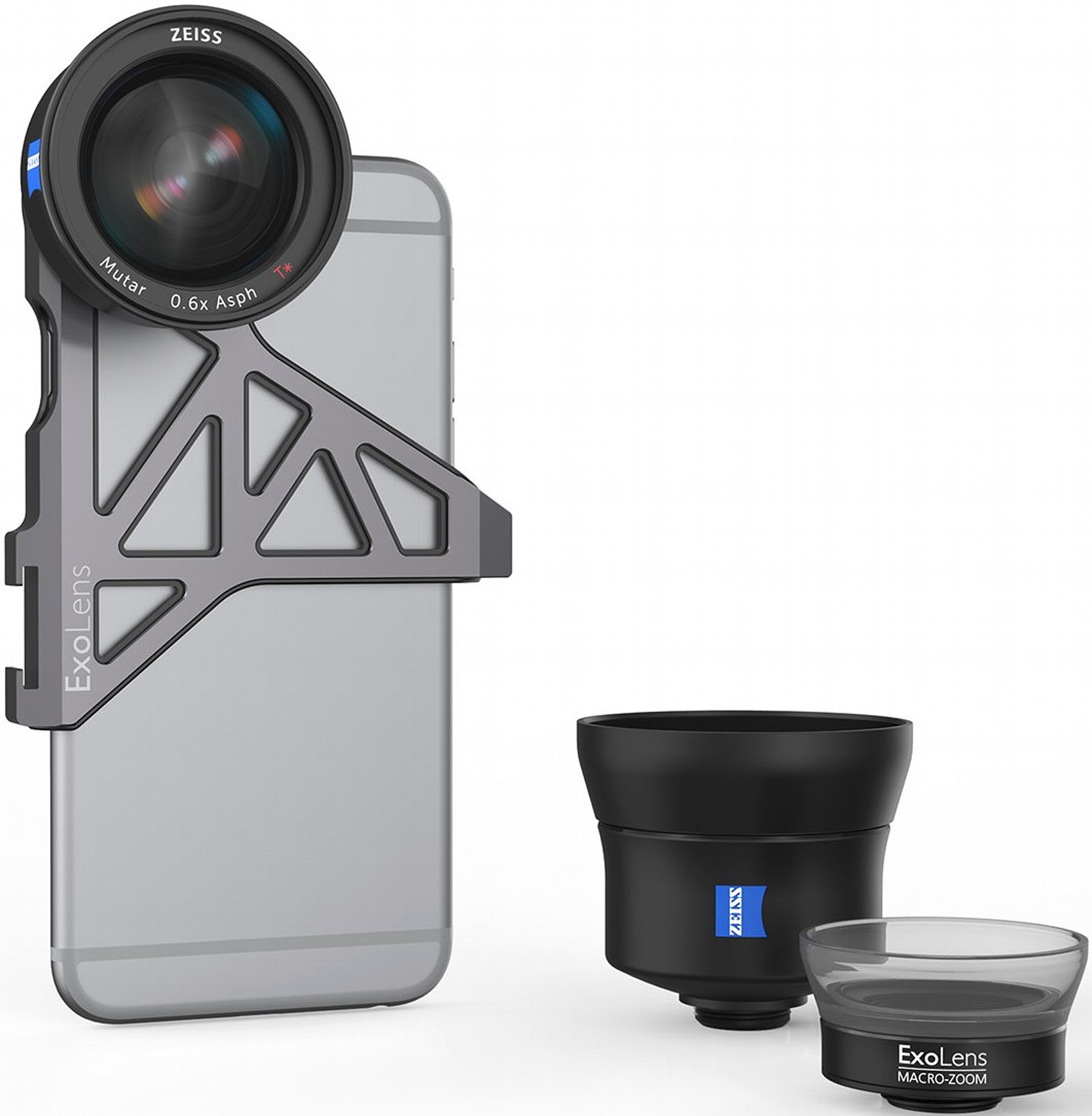 Fellowes und Zeiss versprechen gewohnte Zeiss-Qualität im kleinen Maßstab. Die kleinen ExoLens-Objektive sind spätestens durch das Logo deutlich als Zeiss-Produkte zu erkennen, auch das Produktdesign ist an die aktuellen Zeiss-Wechselobjektive für Systemkameras angelehnt. Die Vorsatzobjektive sind aus schwarz eloxiertem Aluminium gefertigt und können über eine Schraubverbindung mit der für das jeweilige iPhone-Modell angepassten stabilen Halterung kombiniert werden. Jene Halterung deckt dein iPhone nicht komplett ab, sondern nur die obere Hälfte deines Geräts. In der stabilen, aus massivem Aluminium gefrästen Halterung steckt ein Kunststoff-Inley, damit dein iPhone nicht zerkratzt. Da die iPhones der 6s zwei Zehntel Millimeter dicker sind als die iPhones 6 (mutmaßlich durch den zusätzlichen drucksensitiven Layer auf dem Display) gibt es für die Modelle ohne "s" und mit "s" jeweils ein eigenes Inley. Auf solche Genauigkeit kommt es in dieser Qualitätsklasse durchaus an. Ein entsprechendes elastisches Inley könnte keine exakte Position des Objektivs sicherstellen. Neben der Objektivmontage ermöglicht die Hülle dank 1/4"-Gewinde auch die Befestigung des iPhones auf einem Stativ und ein Zubehörschuh bietet Platz für weiteres Zubehör, wie beispielsweise eine LED-Leuchte.