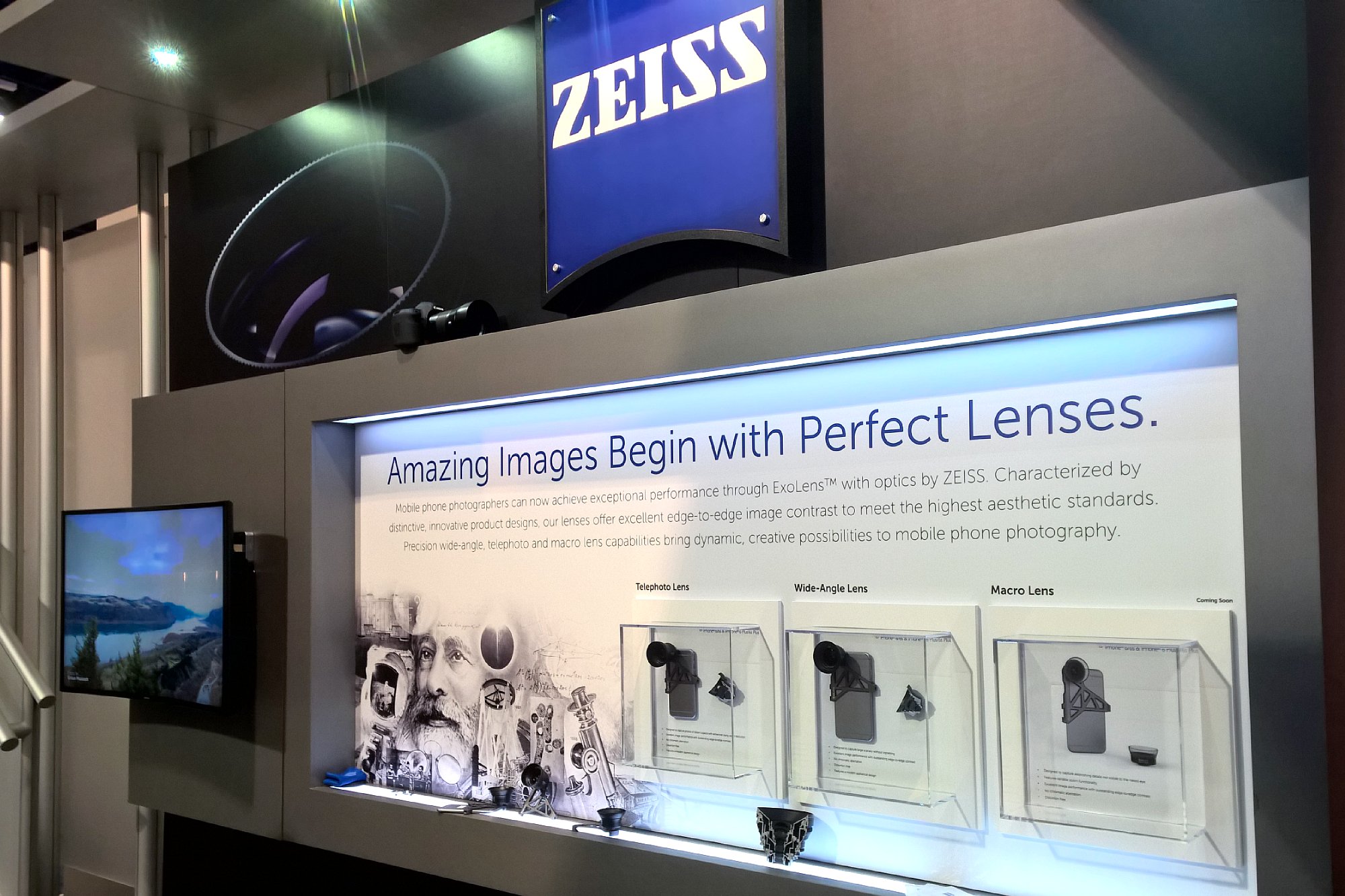 Auf der CES konnten wir uns schon anhand von Fotoausdrucken und im Gespräch mit dem anwesenden Entwickler von der Qualität der Zeiss ExoLens Objektive und der zugehörigen Halterungen überzeugen. Das ist tatsächlich kein "Spielzeug" sondern ernst gemeinte Technik. Bei der Konstruktion (u. a. mit asphärischen Linsen) und der Herstellung wurde erheblicher Aufwand betrieben. Die Halterung sitzt bombenfest, da wackelt nichts. Die Streulichtblende ist abnehmbar und kann wie bei "richtigen" Objektiven verkehrt herum auf das Objektiv gesteckt werden, um beim Transport Platz zu sparen. Die ausgedruckten Beispielbilder konnten überzeugen. Schärfe und Kontrast waren einwandfrei und vom sonst durch Vorsatzobjektive oft produzierten Qualitätsabfall zum Rand hin und von Farbsäumen war nichts zu sehen. Wir freuen uns schon auf einen Labortest dieser Zubehörobjektive.