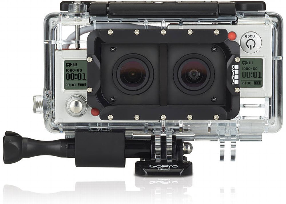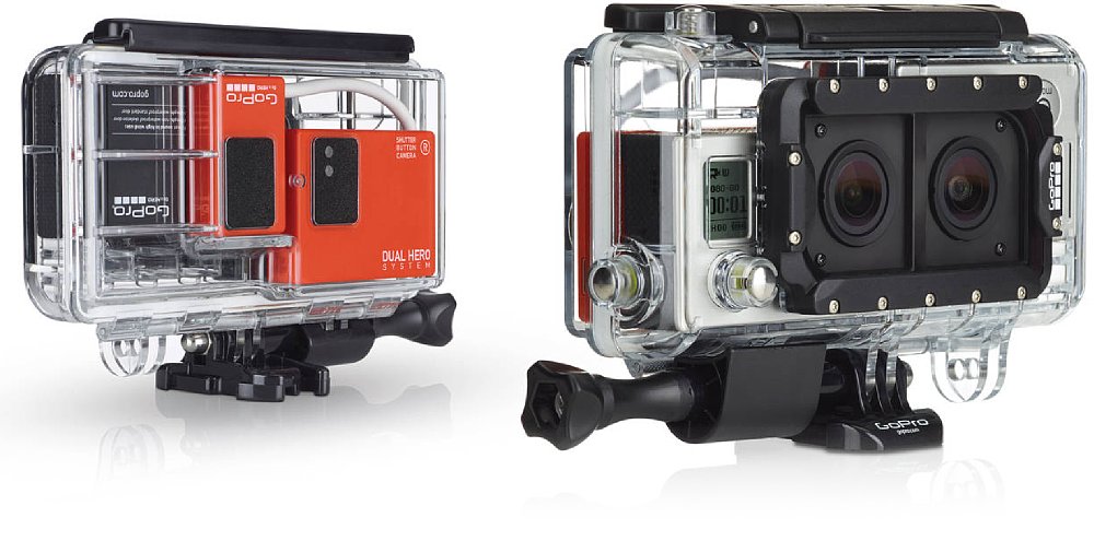 Ein ähnliches System, bestehend aus Doppelgehäuse und Spezial-Synchronisationskabel, gab es schon (bzw. gibt es noch) für die beiden ersten Generationen der GoPro Hero und heißt "3D HERO System", das Gehäuse für die alten Kameras war allerdings nicht wasserdicht. Das neue Gehäuse "Dual Hero System" kostet 219 Euro teure Gehäuse und ist bis 60 Meter wasserdicht. Das Set enthält zwei gebogene und gerade Klebehalterungen für die Montage an deiner Ausrüstung und zwei anaglypher 3D-Brillen zum Betrachten deiner 3D-Inhalte. Das Gehäuse ist noch nicht lieferbar, soll aber in Kürze verfügbar sein. Es ist mit den meisten GoPro-Halterungen kompatibel und der integrierte Mini-USB-Anschluss ermöglicht Datenübertragung, Akkuaufladung und Live-Video-Feeds bei Verwendung mit der mitgelieferten Skeleton-Hintertür.