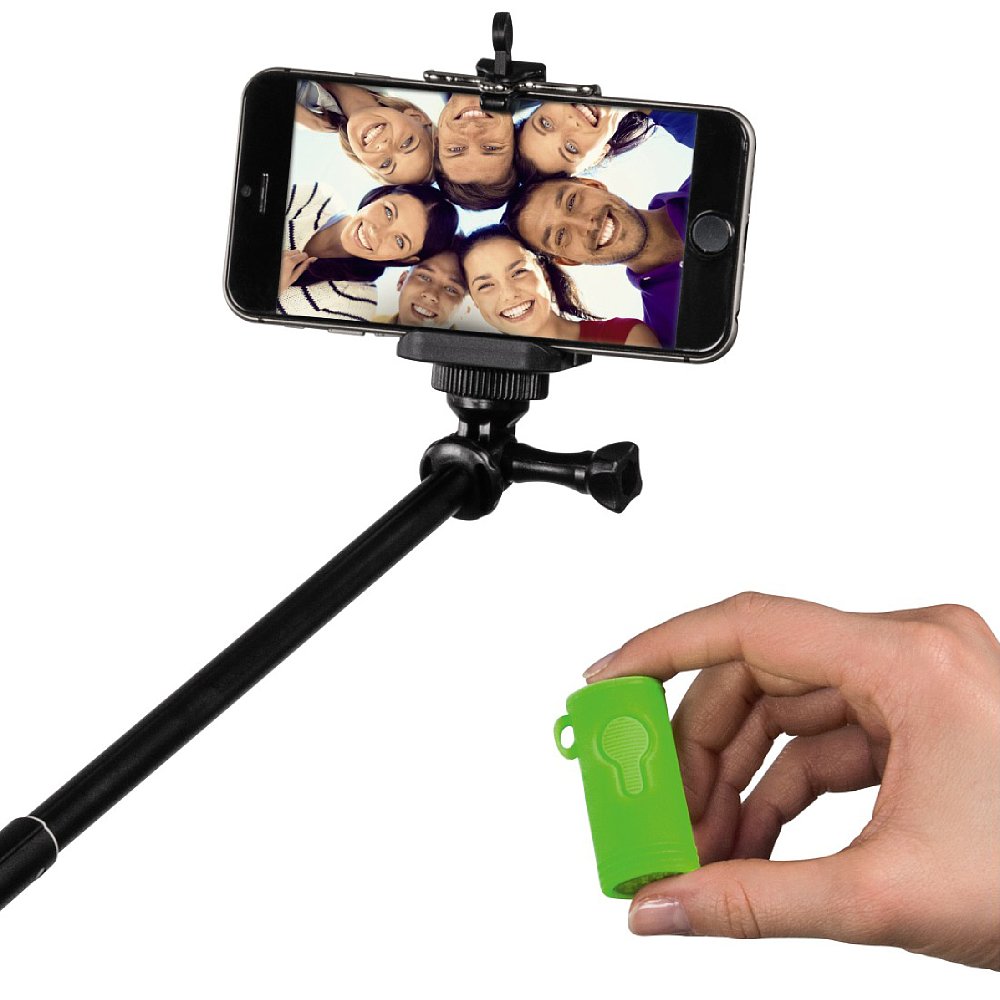 160 Gramm wiegt das Stativrohr (22,99 Euro UVP), die Grundessenz des Hama-Selfie-Helfers. Du kannst es auf 90 cm Länge ausziehen und auf dem Kopf alles aufschrauben, was ein 1/4-Zoll-Stativgewinde besitzt und nicht zu schwer ist, z. B. leichte Fotokameras oder Actioncams. Ein zu den GoPro Hero Halterungen passender Adapter ist in die Konstruktion direkt integriert. Eine Handyklemme, in die Smartphones mit einer Breite von mindestens 5,5 cm und maximal 8,2 cm eingespannt werden können, gibt es optional für 9,99 Euro UVP.