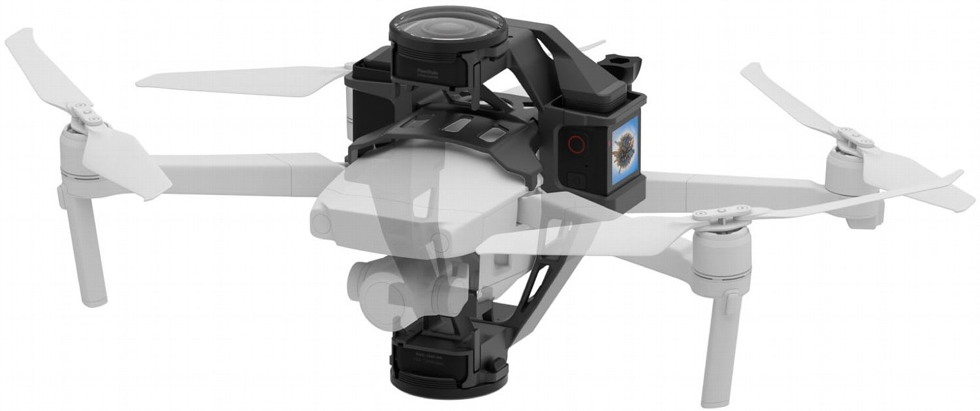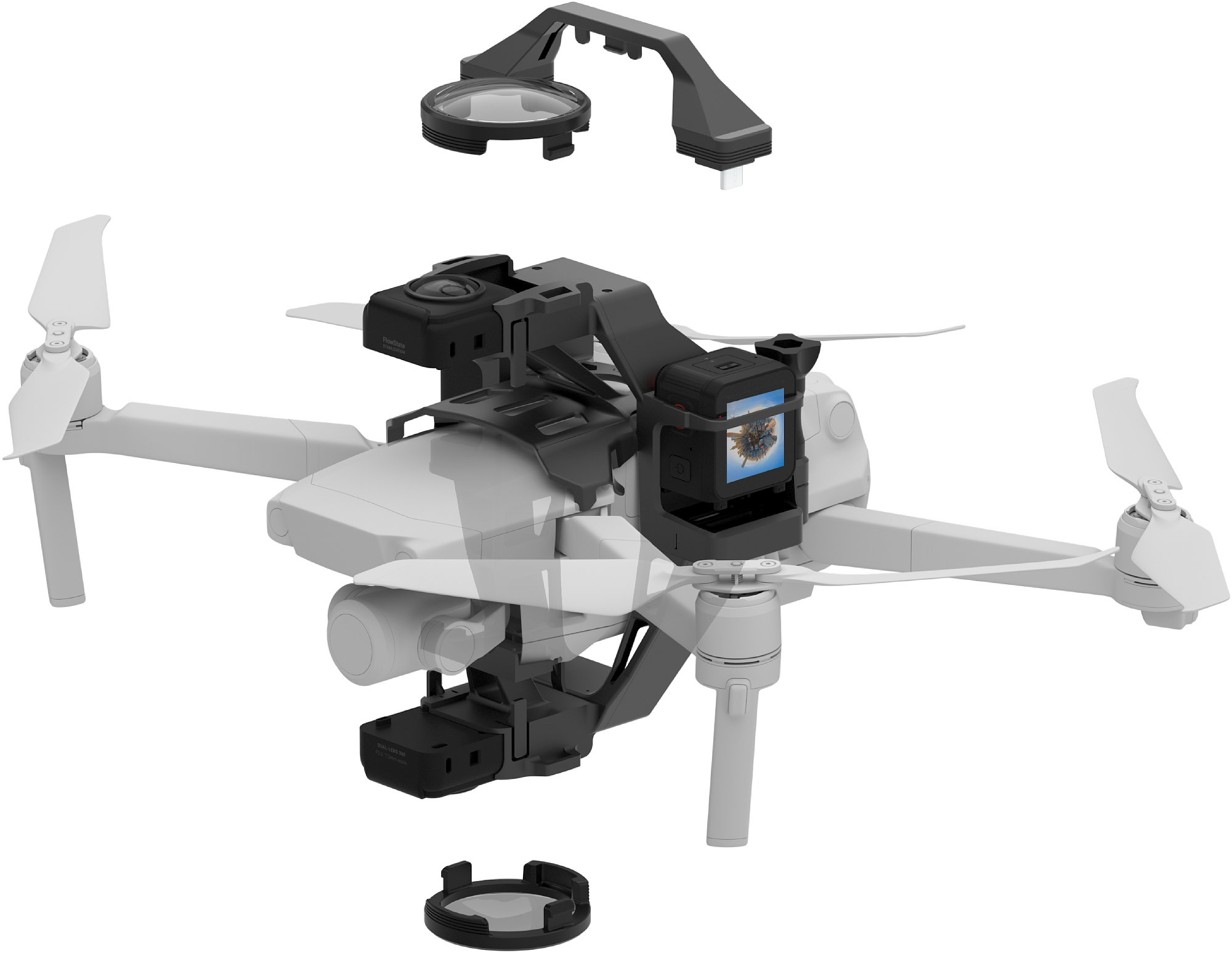 Denn es geht nicht nur darum, an ein Basismodul verschiedene Objektiv-Module anzustecken, sondern es können auch unterschiedlich große Batterie-Basiseinheiten verwendet werden und es gibt externe Mikrofon-Adapter. Darüber hinaus lassen sich zwei einäugige Kameramodule mittels "3D Mod" nebeneinander zu einer 3D-Kamera zusammensetzen, für 180°-Panoramaaufnahmen in 3D gibt es dafür ein Split-Lens 360 Mod. Die Krönung des Ganzen ist ein Montage-Kit, mit dem eben dieses Split-Lens 360 Mod samt Basiseinheit (Core) und diversem anderen Zubehör an einem DJI Mavic 2 Quadrokopter montieren lässt, wodurch dieser dann zur fliegenden 360-Grad-Kamera werden soll.