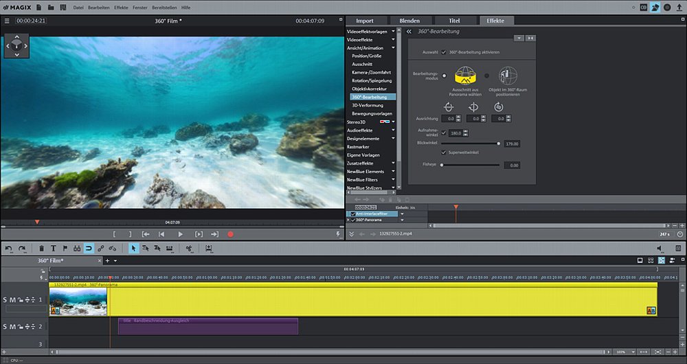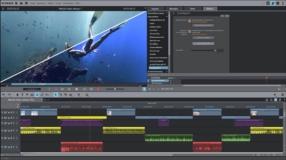 Technisch noch fortgeschrittener ist die Plus-Version von Video deluxe für 99,99 Euro mit einer vollständigen 360°-Unterstützung, die weit über die der letztjährigen Version hinausgehen soll. Vom Import bis zum Upload bietet jetzt Video deluxe erstmalig die Möglichkeit, 360°-Aufnahmen detailgenau aus jedem Blickwinkel zu bearbeiten. 360°-Videos können jetzt sogar mit Titeln, Effekten oder auch Bildern optimiert und anschließend aus dem Programm auf YouTube geteilt werden. Mit dem neuen Look-Abgleich lassen sich Aufnahmen verschiedenster Farb- und Tonwerte miteinander kombinieren und zusätzlich per Knopfdruck eine einheitliche Stimmung schaffen. Hinzugekommen sind auch fünf hochwertige neue Effekte: