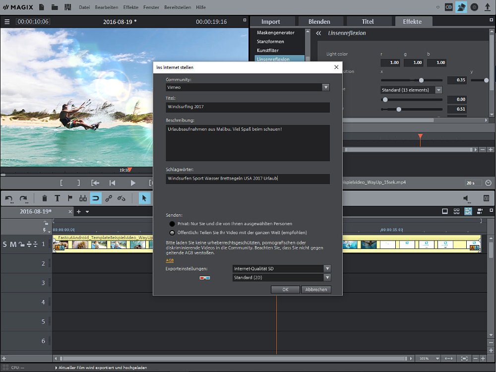 Magix Video deluxe besitzt bereits in der "Classic"-Variante für 69,99 Euro vielfältige Funktionen und großen kreativen Freiraum. Automatische Optimierungen erleichtern Einsteigern die ersten Schritte der Videobearbeitung, während fortgeschrittene Anwender ihre Projekte mit komplexen Tools perfektionieren. Dabei kann Material auf bis zu 99 Spuren mit integrierter proDADMercalli V2 Technologie und Proxy-Videoschnitt bearbeitet werden. Außerdem können nun Plug-ins direkt über die OpenFX-Schnittstelle eingebunden und fertige Filme unmittelbar zu Vimeo oder anderen Anbietern hochgeladen werden.