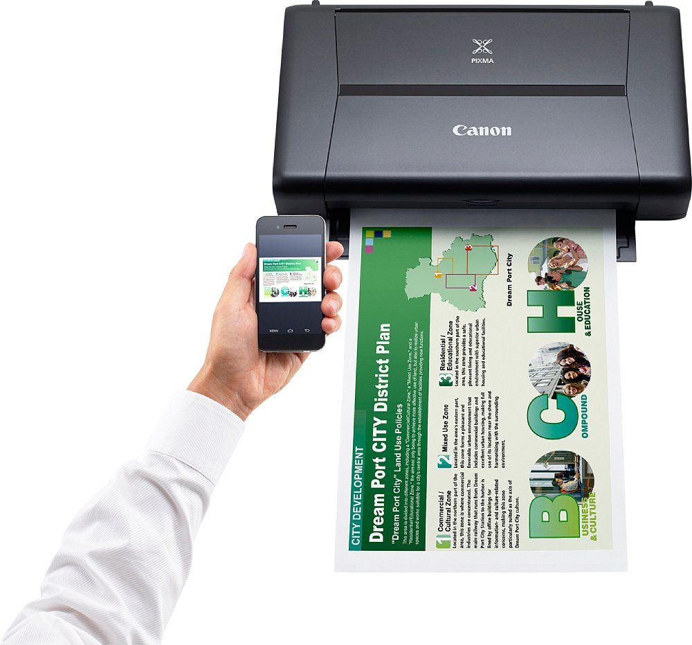 Gedruckt wird über Smartphone und Tablet aus dem Internet unabhängig vom Standort. Wenn du nicht auf Steckdosen angewiesen sein möchtest, kannst du den iP110 sogar mit einem optional erhältlichen Akku aufrüsten. Geschäftsdokumente, PDFs oder JPEGs lassen sich mit dem Pixma Cloud Link direkt von einem Cloud-Service wie Dropbox, Google Drive, OneDrive oder Evernote drucken. Fotos holt sich der kleine Drucker auch aus Facebook, Twitter oder von Online-Alben. Um den iP110 vom Smartphone oder Tablet aus steuern zu können, wird die Canon Pixma Printing Solutions App benötigt. Neben dem Zugang zu Cloud-Serivces können über die App auch der Drucker-Status, die Tintenfüllstände und das Benutzerhandbuch aufgerufen werden. Darüber hinaus unterstützt der iP110 Apple AirPrint und Google Cloud Print. Mit dem Web-basierten Dienst Easy Photo Print+ gestaltet man Grußkarten, Fotocollagen und andere kreative Fotogrüße.