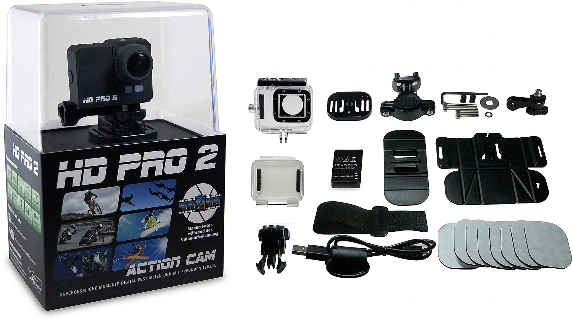 Zu Beginn der Sommersaison kommt die neue Actioncam HD Pro 2 auf dem Markt. Die Kamera im Stil einer GoPro Hero, also im kompakten Querformat mit serienmäßigem wasserdichten Gehäuse, bietet eine gute Ausstattung und standesgemäße technische Daten für einen recht günstigen Preis. Die höchste Auflösung beträgt 1920 x 1080i (also interlaced) bei schnellen 60 Frames pro Sekunde. Im qualitativ besseren Progressiv-Modus 1920 x 1080p sind die üblichen 30 Bilder pro Sekunde möglich. Die maximale Fotoauflösung liegt bei 4384 x 3288 Bildpunkten (4:3-Format) in der Einstellung 20 Megapixel. Auch die bei Actioncams wichtigen Intervall-Aufnahmen beherrscht das Gerät: Ein Bild pro Sekunde oder ein Bild alle 3, 5, 10, 30 und 60 Sekunden. Die Actionaufnahmen können dann über das eingebaute 2,0 Zoll LCD Display direkt angeschaut werden.
