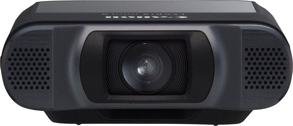 • Bild Canon Legria mini X. Das Objektiv wird in ausgeschaltetem Zustand durch eine Abdeckung gut geschützt. Links und rechts daneben sind die großen Mikrofone. [Foto: Canon]